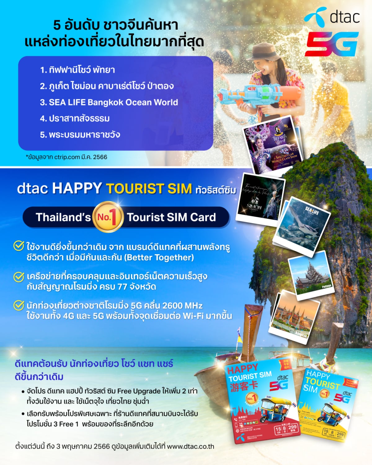 ดีแทค จัดเต็มส่งโปรพิเศษต้อนรับ นักท่องเที่ยว จีน ที่มาเที่ยวไทยให้คึกคัก ในวันหยุดยาวสงกรานต์และช่วงวันแรงงานจีน ด้วยดีแทค แฮปปี้ ทัวริสต์ ซิม ฟรีอัพเกรด ให้เพิ่ม 2 เท่า ทั้งวันใช้งานและอินเทอร์เน็ต ใช้เน็ตจุใจ เที่ยวไทย ชุ่มฉ่ำ