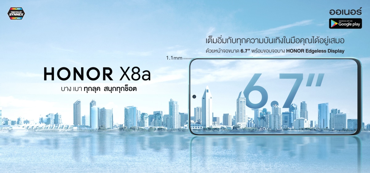 ออเนอร์ (HONOR) ผู้ให้บริการอุปกรณ์อัจฉริยะชั้นนำระดับโลก และบริษัท ซินเน็ค (ประเทศไทย) จำกัด (มหาชน) ผู้นำด้านไอทีอีโคซิสเท็มชั้นนำของเมืองไทย เปิดตัวสมาร์ทโฟนรุ่นใหม่ล่าสุด HONOR X8a จากตระกูล X Series อัดแน่นด้วยฟีเจอร์ตอบโจทย์ไลฟ์สไตล์รอบด้าน มาพร้อม 3 โทนสีโดดเด่นอย่าง Cyan Lake, Titanium Silver และ Midnight Black และดีไซน์ที่สะกดทุกสายตา เพิ่มสุนทรีย์ความบันเทิงไปกับหน้าจอขนาดใหญ่ 6.7 นิ้วและฟังก์ชันถ่ายภาพที่กล้องหลังให้ความคมชัดสูงสุดถึง 100 ล้านพิกเซล ให้คุณสนุกกับทุกโมเมนต์ในทุกวัน มาในราคาที่เข้าถึงได้เพียง 7,999 บาท พร้อมวางจำหน่ายแล้ววันนี้
