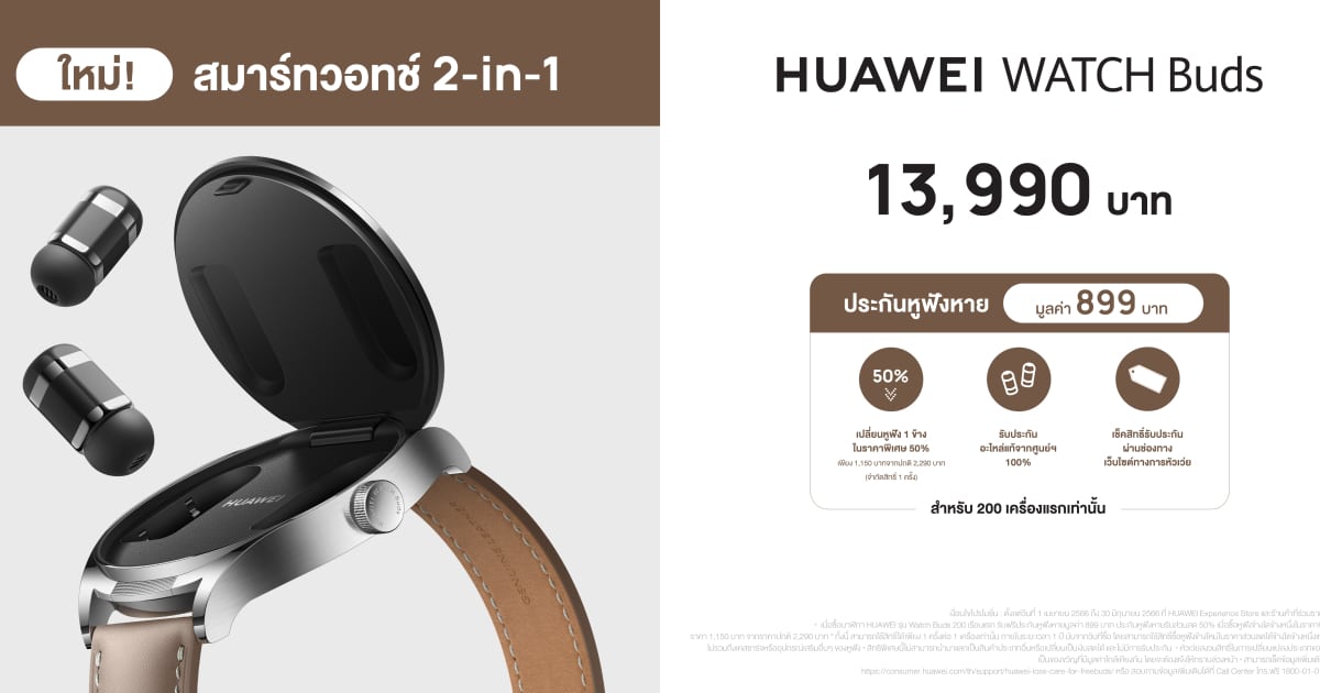 สำหรับใครที่พลาดกดสั่งซื้อ HUAWEI WATCH Buds สมาร์ทวอชท์ 2-in 1 พร้อมหูฟังในตัวทางช่องทางออนไลน์ไม่ต้องเสียดายไป ล่าสุดหัวเว่ยประกาศเพิ่มช่องทางวางจำหน่ายที่ หน้าร้าน HUAWEI Experience Store และร้านค้าตัวแทนจำหน่ายที่ร่วมรายการ รวมถึงช่องทางออนไลน์บนเว็บไซต์ HUAWEI Store พร้อมสิทธิพิเศษ! สำหรับ 200 เครื่องแรก รับฟรีทันที บริการดูแลหูฟังมูลค่า 899 บาท รวมทั้งสามารถเปลี่ยนหูฟัง 1 ข้าง ในราคาพิเศษลด 50% เหลือเพียง 1,150 บาท จากราคาปกติ 2,290 บาท (จำกัดสิทธิ์ 1 ครั้ง) รับประกันอะไหล่แท้จากศูนย์ฯ 100% โดยลูกค้าสามารถเช็คสิทธิ์รับประกันผ่านช่องทางเว็บไซต์ทางการของหัวเว่ย