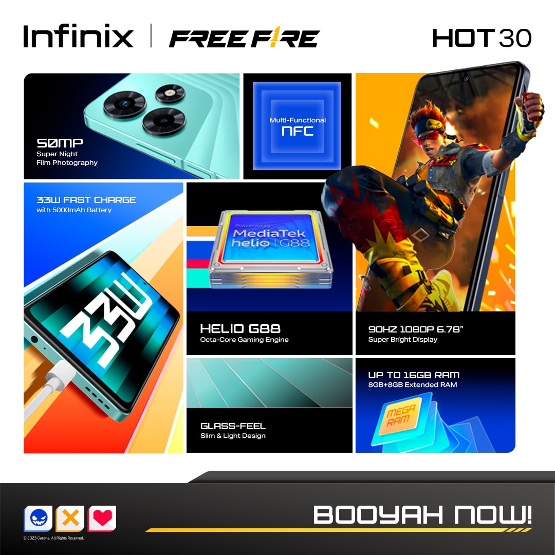 ทั้งนี้ อินฟินิกซ์ยังตั้งใจมอบความพิเศษให้ผู้ใช้งานด้วยการจับมือกับ Free Fire ผลิตแพ็กเกจลิมิเต็ดอิดิชัน พร้อมครีเอทธีมลายวอลเปเปอร์บนมือถือ ด้วยการใช้คาแรกเตอร์หลักจากเกม และมอบไอเทมสุดเอ็กซ์คลูซีฟทั้งในเกมและนอกเกมมากมาย เพื่อตอกย้ำภาพความเป็นเกมมิ่งโฟนและเอาใจเหล่าสาวกคอเกมตัวจริง นอกจากนี้เตรียมพบกับเซอร์ไพรส์ในกิจกรรม HOT 30 Booyah Challenge NOW! ที่เปิดโอกาสให้ทุกคนร่วมสนุกเพื่อลุ้นรับของรางวัล HOT 30 Free Fire Limited Box Set จำนวน 3 รางวัล และ Gift Code Alvaro Item สามารถร่วมสนุกได้ตั้งแต่วันที่ 9 เมษายน – 9 พฤษภาคม 2566 เพียงถ่ายคลิปดูเอ็ทรีวิวมือถือ Infinix HOT 30 ตามสไตล์ของคุณ แล้วอัปโหลดคลิปลงในช่อง TikTok พร้อมติดแฮชแท็ก #InfinixHOT30FREEFIRE สามารถติดตามรายละเอียดเพิ่มเติมได้ที่เพจเฟซบุ๊ก Infinix Mobile Thailand