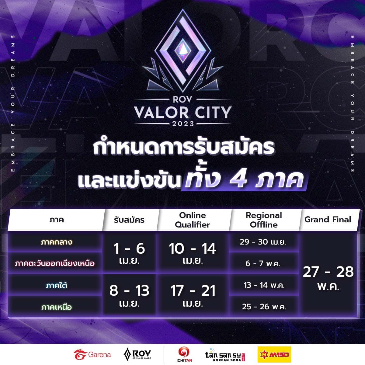 RoV Valor City 2023 คือทัวร์นาเมนต์การแข่งขัน RoV สี่ภาคชิงรางวัลมูลค่ารวม 1,000,000 บาท แบ่งออกเป็น ภาคกลาง ภาคตะวันออกเฉียงเหนือ ภาคเหนือ และภาคใต้ ทัวร์นาเมนต์นี้เปิดโอกาสให้ผู้ที่มีความฝันอยากเป็นนักกีฬาอีสปอร์ต หรืออยากมีประสบการณ์ในการแข่งขัน RoV สามารถรวมทีมเข้าร่วมการแข่งขันนี้ได้ อีกทั้งภายในงานยังมีกิจกรรม สกินฟรี และของรางวัลจาก RoV มาแจกกันแบบจัดเต็ม สามารถเข้าร่วมงานได้ฟรี ไม่เสียค่าใช้จ่ายใด ๆ ทั้งสิ้น