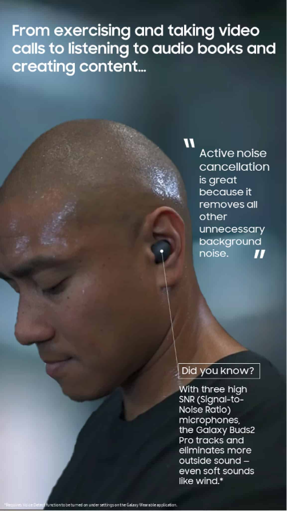 จากการออกกำลังกาย สู่วิดีโอคอล ไปจนถึงการฟัง audio book และการสร้างสรรค์คอนเทนต์ ฟิลิ ทาปาล้วนพึงพอใจเป็นอย่างยิ่งกับ Galaxy Buds2 Pro และด้วยฟีเจอร์ Active noise cancellation ที่ช่วยให้เขาสามารถสนุกไปกับทุก ๆ กิจกรรมโดยปราศจากเสียงรบกวนรอบด้าน และด้วยไมโครโฟน SNR (Signal-to-Noise Ratio) ระดับสูงสามตัว ทำให้ Galaxy Buds2 Pro สามารถติดตามและกำจัดเสียงรบกวนที่ไม่จำเป็น แม้กระทั่งเสียงลมพัดเบา ๆ ได้อย่างดีเยี่ยม