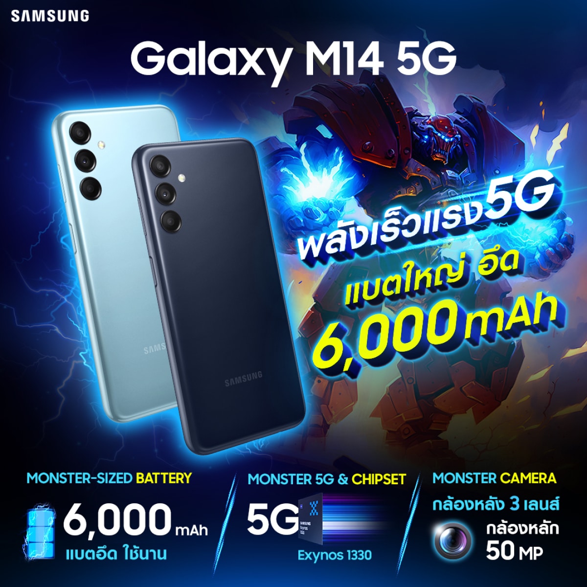 ซัมซุงเปิดตัว Monster ตัวใหม่ อย่าง Samsung Galaxy M14 5G สมาร์ทโฟนราคาเริ่มต้นสุดประหยัดที่มาพร้อมกับ แบตอึดถึง 6,000mAh ใช้งานได้ยาวนานไม่ขาดตอน มาพร้อมกับ 5G ที่เสริมพลังด้วยชิปเซ็ตประมวลผล Exynos1330 เร็วแรงสะใจ ใช้งานได้ไหลลื่นได้นาน ไม่มีสะดุดตอบโจทย์ทุกการใช้งาน ตอกย้ำความเป็น Monster ตัวใหม่ไม่แพ้ใคร กับ 4 พลัง Monster จัดเต็มจุใจในราคาที่คุ้มสุด ๆ