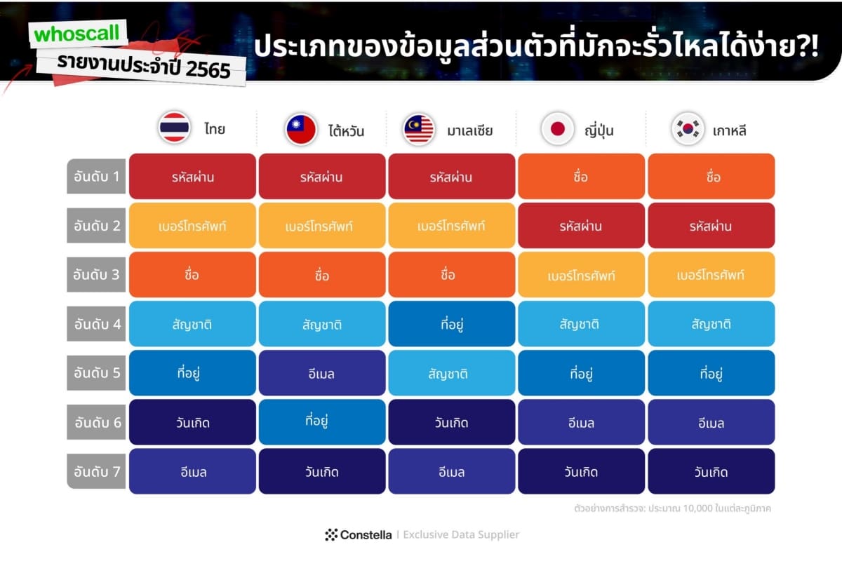 ข้อมูลส่วนตัวที่รั่วไหลมักเป็นด่านแรกที่มิจฉาชีพใช้เข้าถึงรายละเอียดการติดต่อเพื่อหลอกลวงเหยื่อ การรั่วไหลอาจเกิดขึ้นจาก ฐานข้อมูลขององค์กรหรือรัฐบาลถูกโจมตีทางไซเบอร์ หรือเมื่อผู้ใช้กรอกแบบสำรวจ แบบทดสอบทางจิตวิทยา หรือแบบฟอร์มในเว็บไซต์ฟิชชิ่ง เพื่อลดภัยคุกคามตั้งแต่เริ่มต้น Gogolook ผู้พัฒนาแอปพลิเคชัน Whoscall และ Constella Intelligence ผู้ให้บริการป้องกันความเสี่ยงทางดิจิทัลระหว่างประเทศ ร่วมกันวิเคราะห์การรั่วไหลของเบอร์โทรศัพท์ในหลาย ประเทศ พบว่า ในประเทศไทยมีการรั่วไหลของเบอร์โทรศัพท์ 45% ทั้งนี้ รหัสผ่าน เบอร์โทรศัพท์ และชื่อ เป็นข้อมูลส่วนตัว ที่มีการรั่วไหลมากที่สุด ตามด้วยสัญชาติ อีเมล ที่อยู่ และวันเกิด
