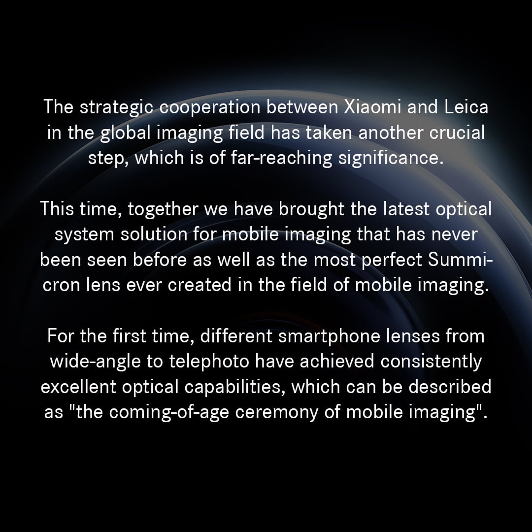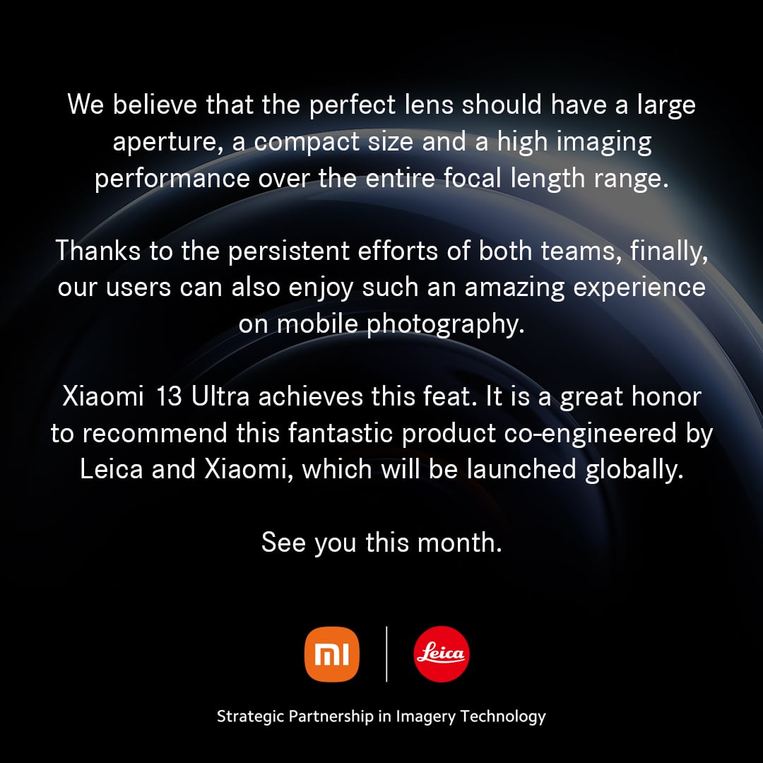 เป็นการประกาศผ่านทางบัญชีทางการของ Xiaomi บน Weibo และทาง Twitter ของLeica เกี่ยวกับความร่วมมือในการพัฒนาสมาร์ทโฟนร่วมกันอย่างต่อเนื่อง ตั้งแต่รุ่น Xiaomi 12 Series และครั้งนี้ได้ออกมายืนยันว่า ทั้ง 2 บริษัทยังเดินหน้าพัฒนาระบบการถ่ายกล้องบนสมาร์ทโฟนให้ดีขึ้นไปอีกขั้น โดยจะเปิดตัว Xiaomi 13 Ultra ในเร็วๆ นี้ โดยระบุว่าจะเปิดตัวในช่วงเดือนเมษายนนี้ (เดือนนี้)