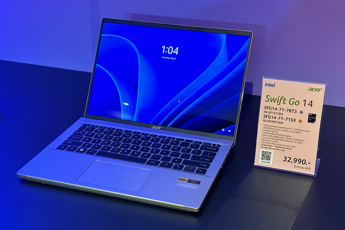 Acer Swift Go 14 ชิปประมวลผล 13th Generation Intel® Core™ i7-13700H จำหน่ายใน ราคา 32,990 บาท และ 13th Generation Intel® Core™ i5-13500H จำหน่ายในราคา 29,990 บาท (รวมภาษีมูลค่าเพิ่ม)