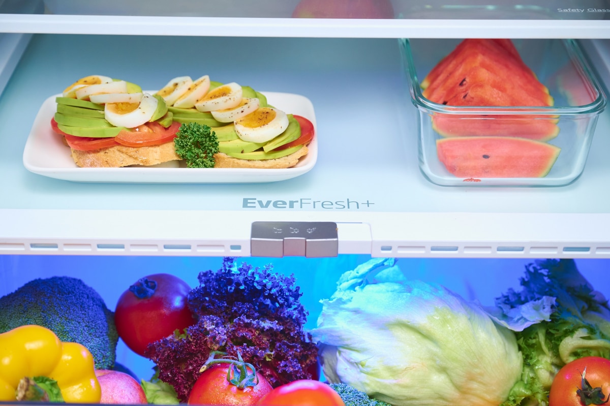 ปรับระดับการไหลเวียนของอากาศและควบคุมความชื้นด้วยเทคโนโลยี EverFresh ที่จะช่วยยืดอายุของวัตถุดิบพร้อมคงความสดของผักและผลไม้ยาวนานขึ้น 3 เท่า โดยไม่ต้องห่วงเรื่องค่าไฟเพราะมีเทคโนโลยี ProSmart Inverter Compressor ที่มีความทนทานสูงประหยัดพลังงานได้มากกว่า 45%
