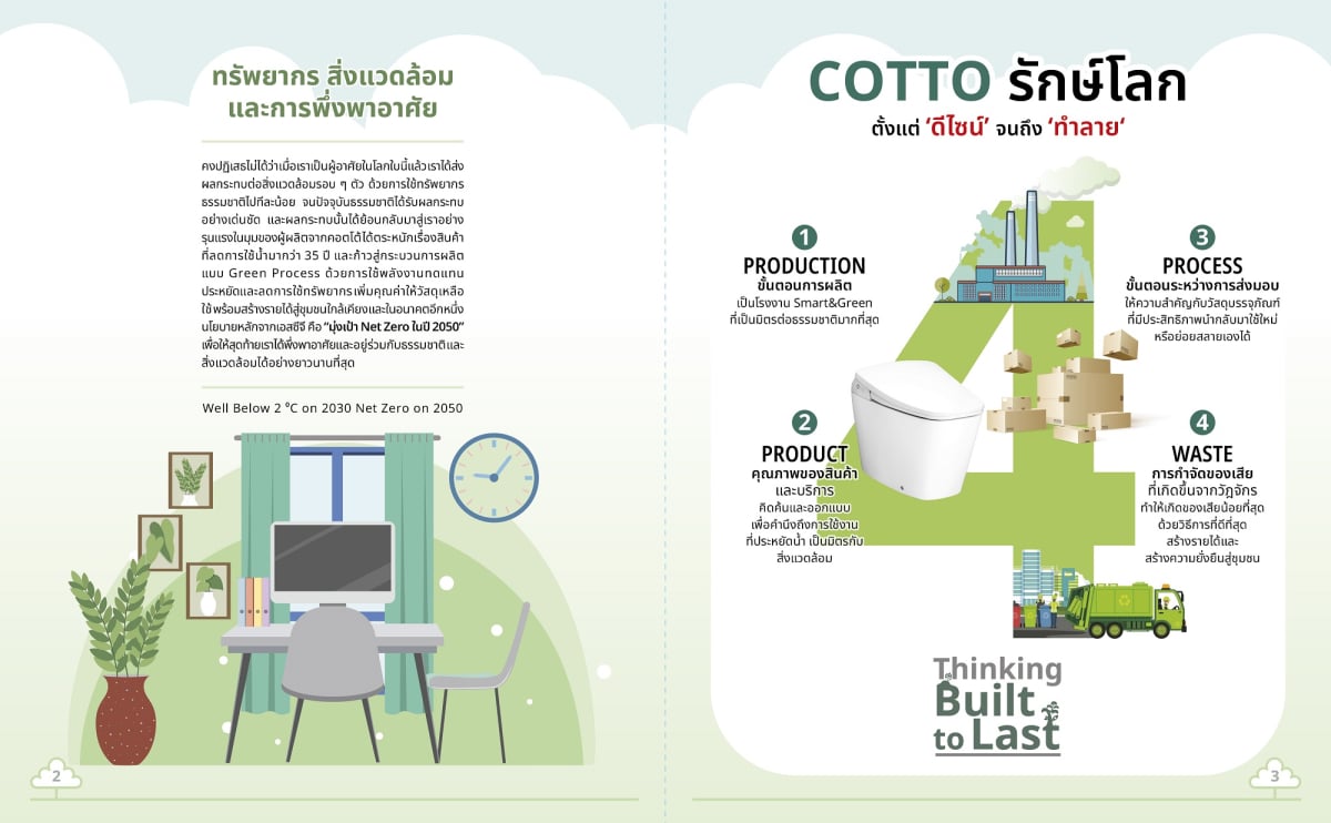 คอตโต้ มุ่งมั่นเพื่อเป็นส่วนหนึ่งของที่อยู่อาศัยอย่างยั่งยืน ด้วยการใช้พลังงานหมุนเวียนในการผลิต และลดการใช้น้ำและลดปริมาณขยะที่เกิดจากการผลิต และผลิตภัณฑ์ทุกชิ้น ผลิตภายใต้แนวคิด Thinking Build to Last
