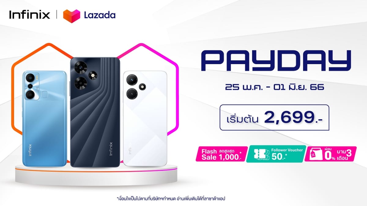 อินฟินิกซ์ (Infinix) แบรนด์สมาร์ตโฟนราคาคุ้มค่า ครบครันทุกการใช้งาน และตอบโจทย์ไลฟ์สไตล์คนรุ่นใหม่ จัด โปรโมชัน สุดปังส่งท้ายช่วงปลายเดือน ในช่วงเวลา Flash Sale กับแคมเปญ PAYDAY เอาใจสาวกนักชอปออนไลน์และผู้ใช้งานทุกคน ให้สามารถเป็นเจ้าของมือถือรุ่นฮิตในราคาที่คุ้มค่ามากที่สุด ด้วยการมอบส่วนลดสูงสุด 1,000* บาท พร้อมรับข้อเสนอพิเศษผ่อน 0% นาน 10 เดือน* เมื่อซื้อสินค้าที่ร่วมรายการ โดยสามารถซื้อสินค้าได้ที่ร้าน Infinix Official Store บน Shopee, Lazada และ Tiktok Shop