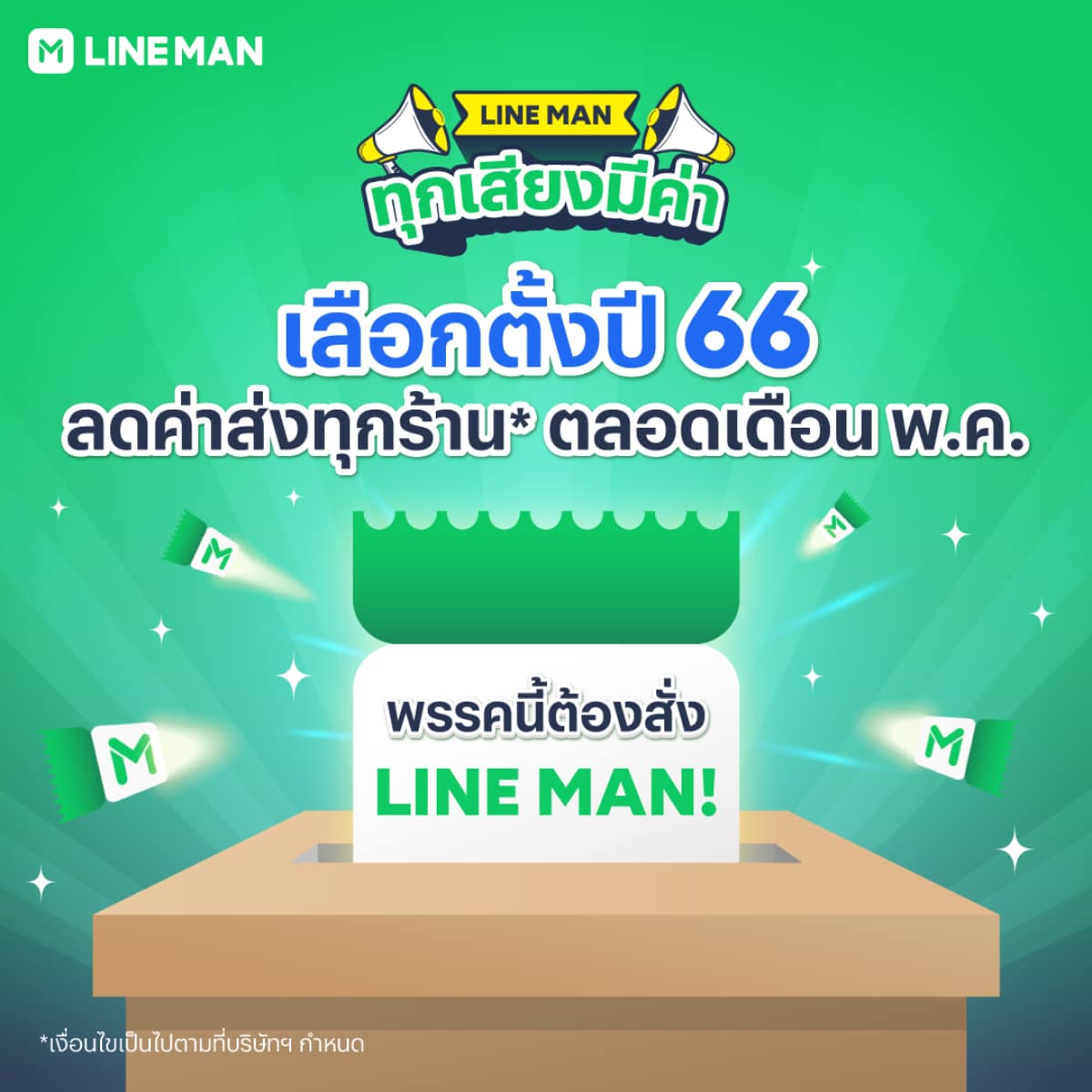 LINE MAN ส่งแคมเปญ “ทุกเสียงมีค่า” รับกระแส เลือกตั้ง แจกโค้ด ส่วนลด ค่าส่งสูงสุดถึง 66 บาท ตลอดเดือนพฤษภาคมนี้
