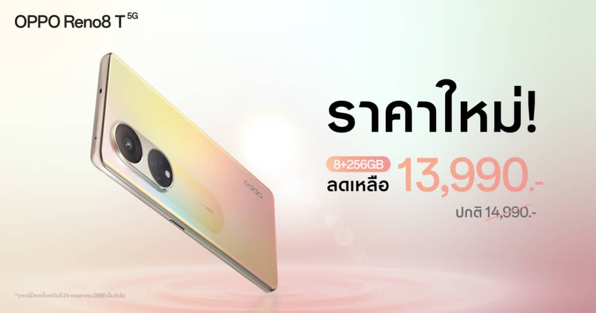 OPPO Reno8 T 5G รุ่น 8+256GB ความจุเยอะขึ้น สมาร์ตโฟน The Portrait Expert ที่ถ่ายพอร์ตเทรตได้สวย คมชัดที่สุดด้วย 108MP Portrait Camera และสเปคอัปเกรดในทุก ๆ ด้าน พร้อมให้คุณเป็นเจ้าของได้ง่ายยิ่งขึ้นใน ราคา ใหม่เพียง 13,990 บาท จากราคาปกติ 14,990 บาท ตั้งแต่วันที่ 24 พฤษภาคม 2566 เป็นต้นไป