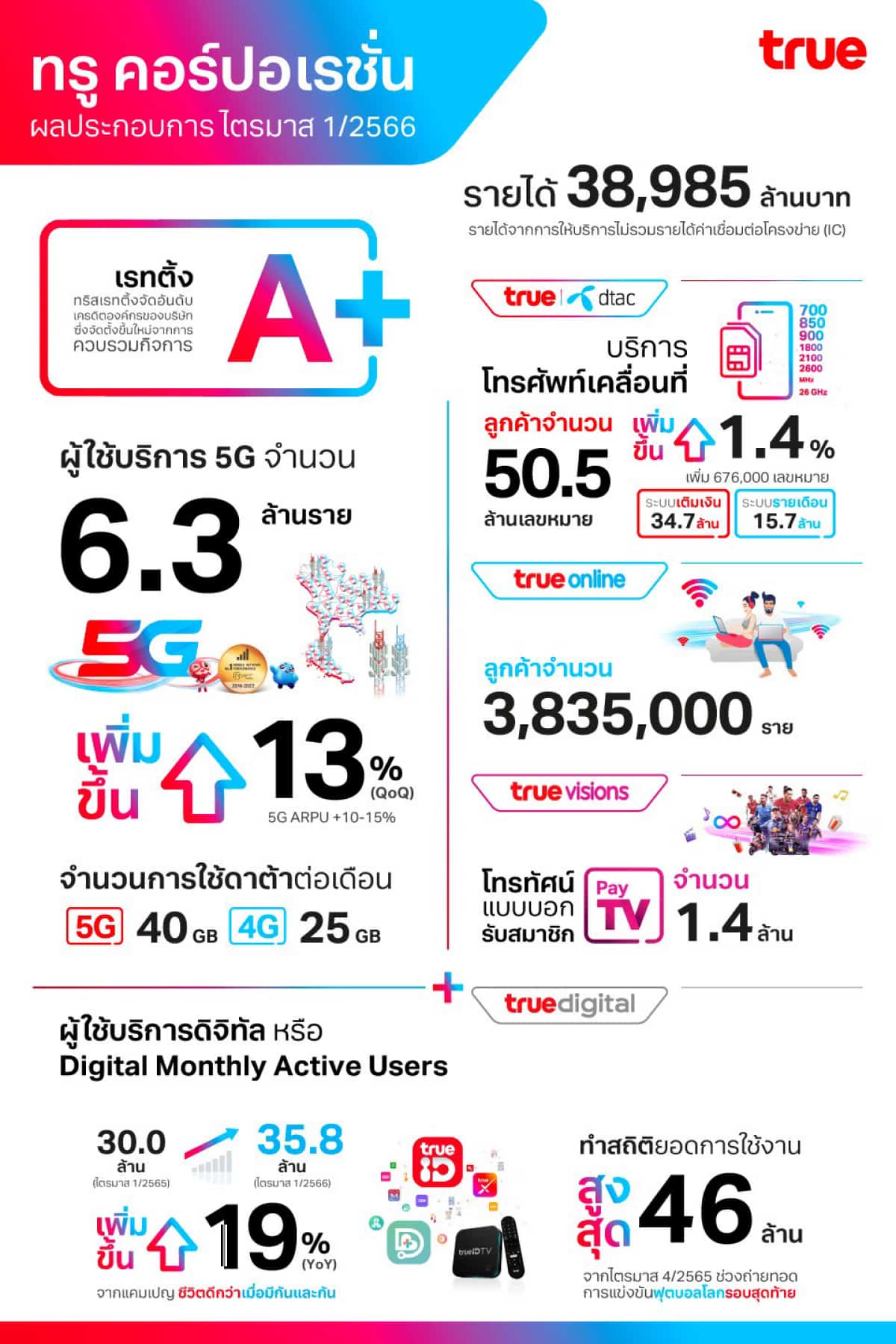 ในไตรมาสที่ 1 ปี 2566 ผู้ใช้บริการมือถือเพิ่มขึ้น 676,000 เลขหมาย ไปอยู่ที่ระดับ 50.5 ล้านเลขหมาย หรือเพิ่มขึ้น 1.4% จากไตรมาสที่ 4 ปี 2565 ผู้ใช้บริการ 5G มีจำนวนถึง 6.3 ล้านเลขหมาย เพิ่มขึ้น 13% เมื่อเทียบกับไตรมาสก่อน (QoQ) โดยมีปริมาณการใช้งานที่เพิ่มขึ้น และ 5G มีรายได้เฉลี่ยต่อเลขหมายต่อเดือน (ARPU) ที่เพิ่มขึ้น 10 – 15% ผู้ใช้งานดิจิทัลรายเดือน (MAU) สูงถึง 35.8 ล้านราย เพิ่มขึ้น 19% เมื่อเปรียบเทียบกับช่วงเดียวกันของปีก่อน (YoY) ซึ่งได้แรงหนุนอย่างต่อเนื่องจากแคมเปญชีวิตดีกว่า เมื่อมีกันและกัน หรือ Better Together หลังจากการควบรวมกิจการเสร็จสิ้น ทั้งนี้ ในไตรมาสที่ 4 ปี 2565 ยอดผู้ใช้งานดิจิทัล (MAU) ทำสถิติสูงสุดเป็นประวัติการณ์ถึง 46.0 ล้านราย จากการถ่ายทอดรายการแข่งขันฟุตบอลโลกรอบสุดท้าย (FIFA World Cup Final 2022)