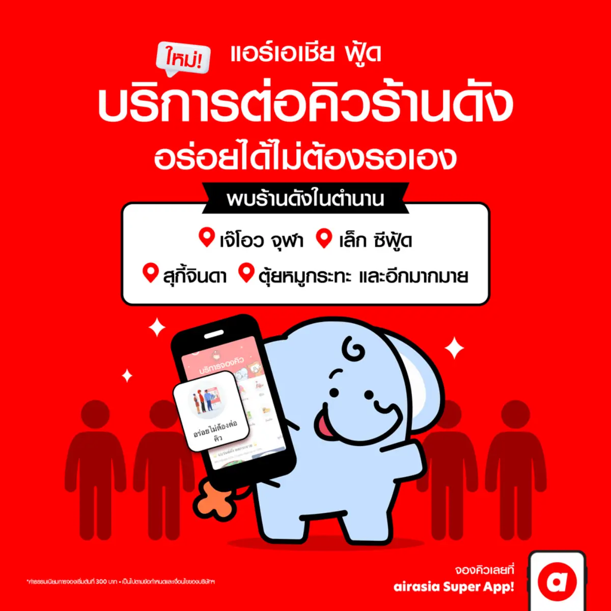 ปัจจุบัน airasia Super app มีการให้บริการต่อคิวร้านดัง ทั้งหมด 13 ร้าน 17 สาขา อาทิ เจ๊โอว จุฬา (JEH O CHULA), เล็ก ซีฟู้ด (Lek Seafood), CQK, เปิ้ล หมูกะทะ, อี้จาสุกี้หม่าล่า สาขา สะพานควาย วัชรพล บรรทัดทอง, ป้านี กุ้งแช่น้ำปลา,เตี๋ยวแม่กลอง&เล้งแซ่บ (JODD FAIRS), แม่กลอง หัวปลาหม้อไฟ (Mae Klong Seafood), ตุ๋ยหมูกระทะ สาขาโพธิ์นิมิตร ตลาดพลู เจริญนคร 10, ก๋วยจั๊บอ้วนโภชนา (หน้าโรงหนัง) และสุกี้จินดา สาขาประชาราษฏร์บำเพ็ญ ซอย 5 สาขา ลาดพร้าว วังหิน 26 สาขาประชาราษฏร์บำเพ็ญ ซอยระหว่าง 9-11