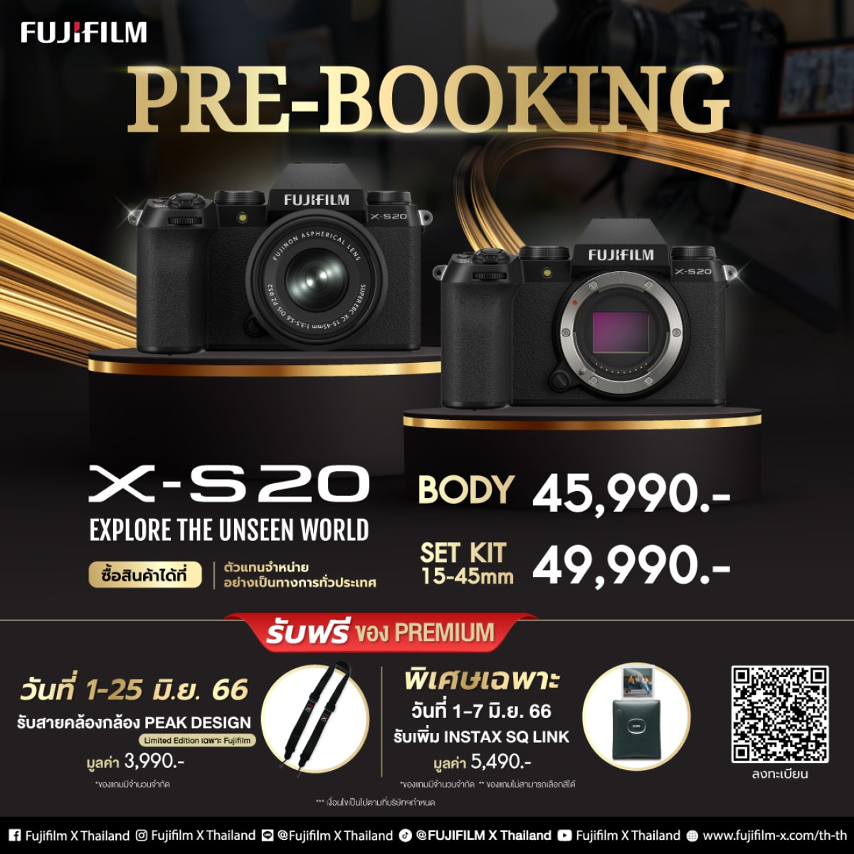 ผู้ที่จองล่วงหน้าสามารถลงชื่อเพื่อรับของแถมพร้อมผลิตภัณฑ์ได้ที่ https://fujifilmth.com/Pre-Booking-X-S20 และรับสินค้าพร้อมกันทั่วประเทศในวันที่ 29 มิถุนายน 2566