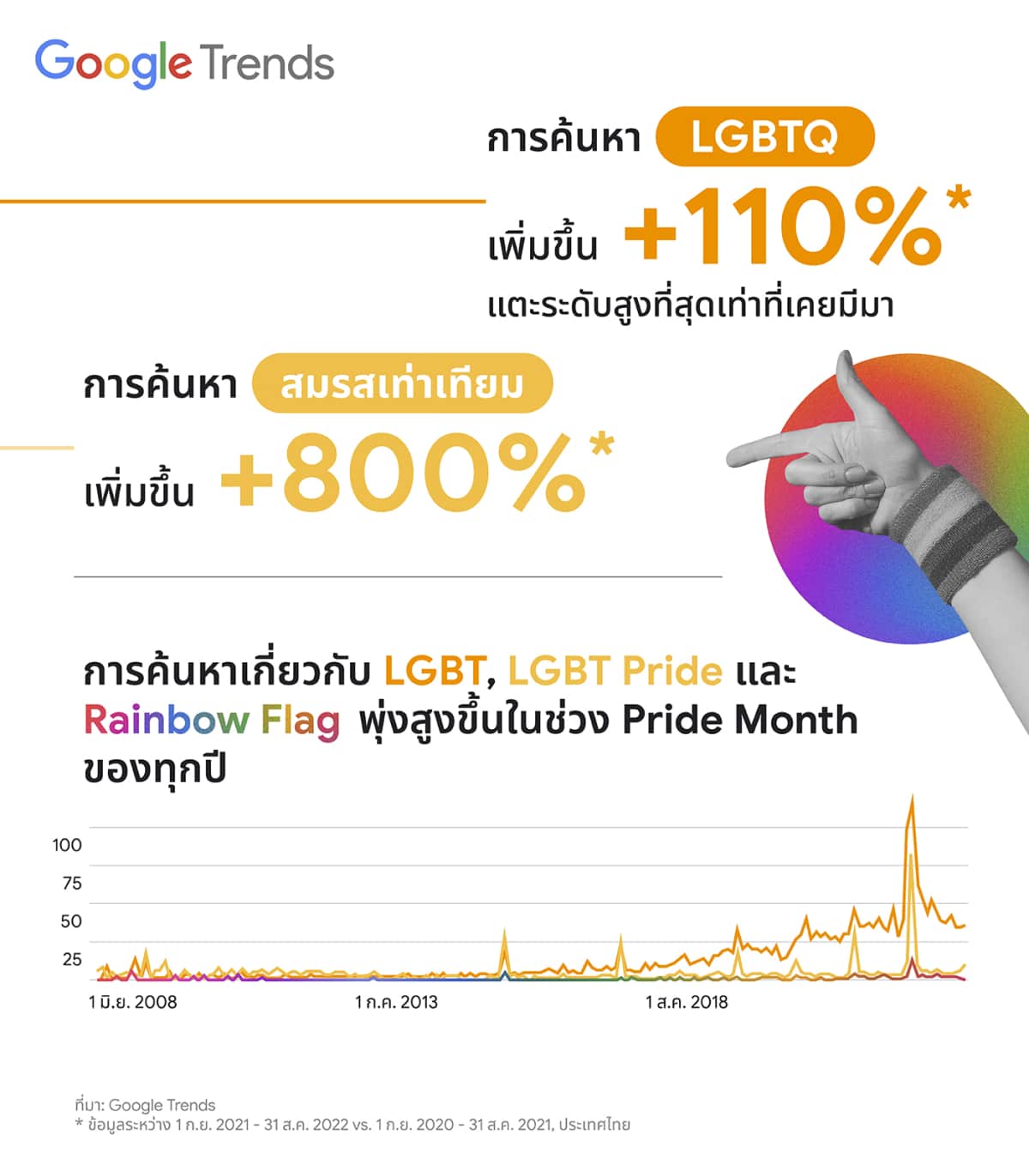 Google ประเทศไทย ร่วมฉลอง “Pride Month” มุ่งเน้นการให้ความสำคัญด้านความหลากหลาย ความเท่าเทียมอย่างสม่ำเสมอ โดยในช่วงปีที่ผ่านมาคนไทยให้ความสนใจเกี่ยวกับความหลากหลายทางเพศในหัวข้อต่าง ๆ มากขึ้น โดยจากรายงาน Year in Search ของประเทศไทย ในปี 2022 มีการค้นหา “LGBTQ” เพิ่มขึ้น 110% ซึ่งแตะระดับสูงที่สุดเท่าที่เคยมีมา และการค้นหา “สมรสเท่าเทียม” เพิ่มขึ้น 800%1