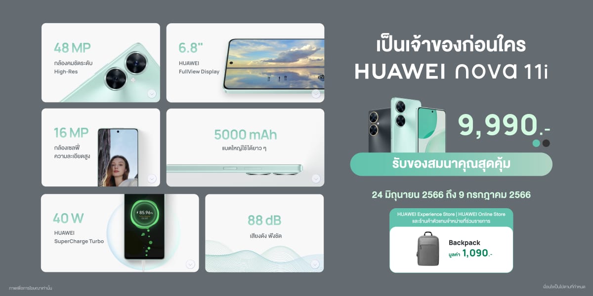 สำหรับ HUAWEI nova 11i มาพร้อมตัวเลือก 2 สี คือ Mint Green และ Starry Black วางจำหน่ายในราคา 9,990 บาท พร้อมโปรโมชันเมื่อสั่งซื้อตั้งแต่ 24 มิถุนายน 2566 ถึง 9 กรกฎาคม 2566 รับฟรี! กระเป๋า HUAWEI Backpack มูลค่า 1,090 บาท เมื่อสั่งซื้อทางหน้าร้าน HUAWEI Experience Store และร้านค้าตัวแทนจำหน่ายที่ร่วมรายการ รวมทั้งช่องทางออนไลน์บนเว็บไซต์ HUAWEI Store ร้านค้าอย่างเป็นทางการของหัวเว่ยบนแพลตฟอร์มออนไลน์ที่ Shopee