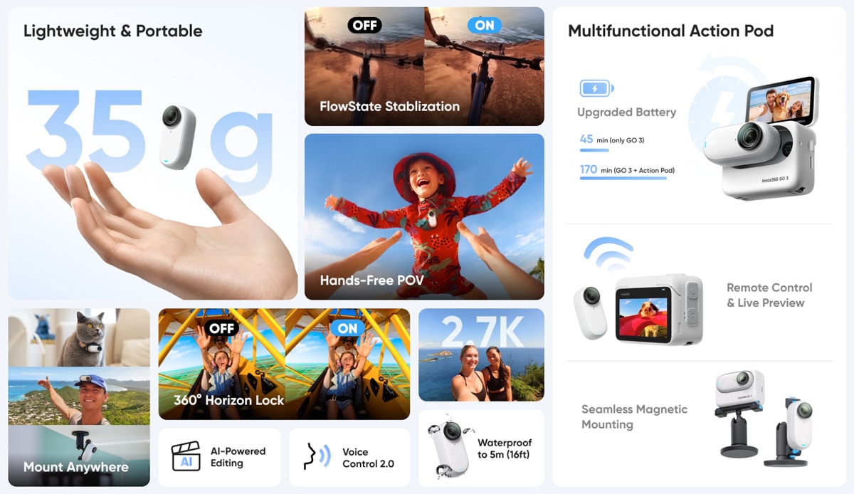 เปิดตัว Insta360 GO 3 กล้องขนาดจิ๋ว เล็กกว่านิ้วโป้ง หนักเพียง 35 กรัม ถ่ายวิดีโอได้ระดับ 2.7K ใช้ต่อกับอุปกรณ์เสริม Action Pod ใช้งานเป็นกล้องแอคชันแคม พร้อมกับมีจอพับใช้งานได้หลากหลายและสะดวกมากขึ้น พร้อมวางจำหน่ายแล้ว ราคา เริ่มต้นที่ 13,990 บาท