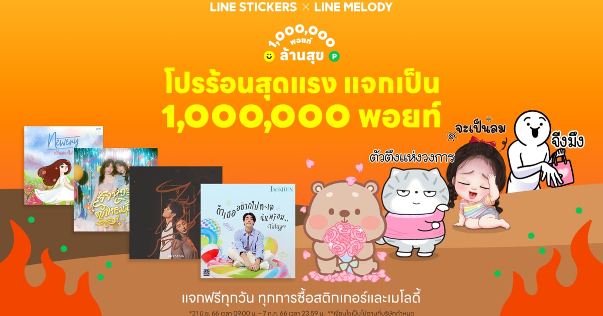 LINE STICKERS ร่วมกับ LINE MELODY ปล่อยแคมเปญพิเศษกลางปี “โปร ร้อนสุดแรง แจกเป็นล้านพอยท์” แจก LINE POINTS แบบไม่อั้นกว่าล้านพอยท์ สำหรับทุกการซื้อ LINE STICKERS และ LINE MELODY เพื่อนำไปใช้เป็นส่วนลดแทนเงินสด สำหรับช้อป กิน เที่ยว เดินทาง จ่ายค่าน้ำ ค่าไฟ ได้ไม่จำกัด