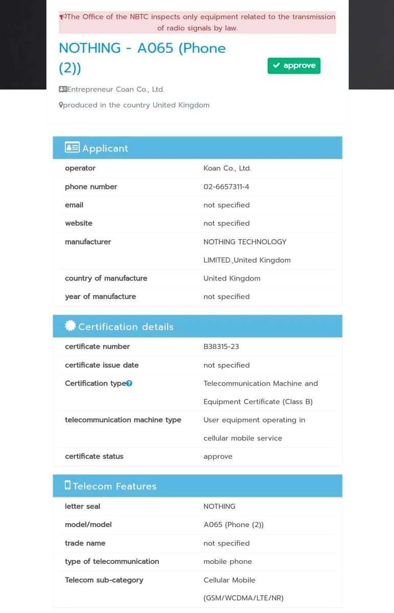 พบข้อมูล Nothing Phone (2) ผ่านการตรวจสอบของทาง กสทช. เรียบร้อยแล้ว คาดว่าเตรียม เปิดตัว อย่างเป็นทางการวันที่ 11 กรกฎาคมนี้ และอาจจะเปิด ราคา พร้อมประกาศวันวางจำหน่ายเลย
