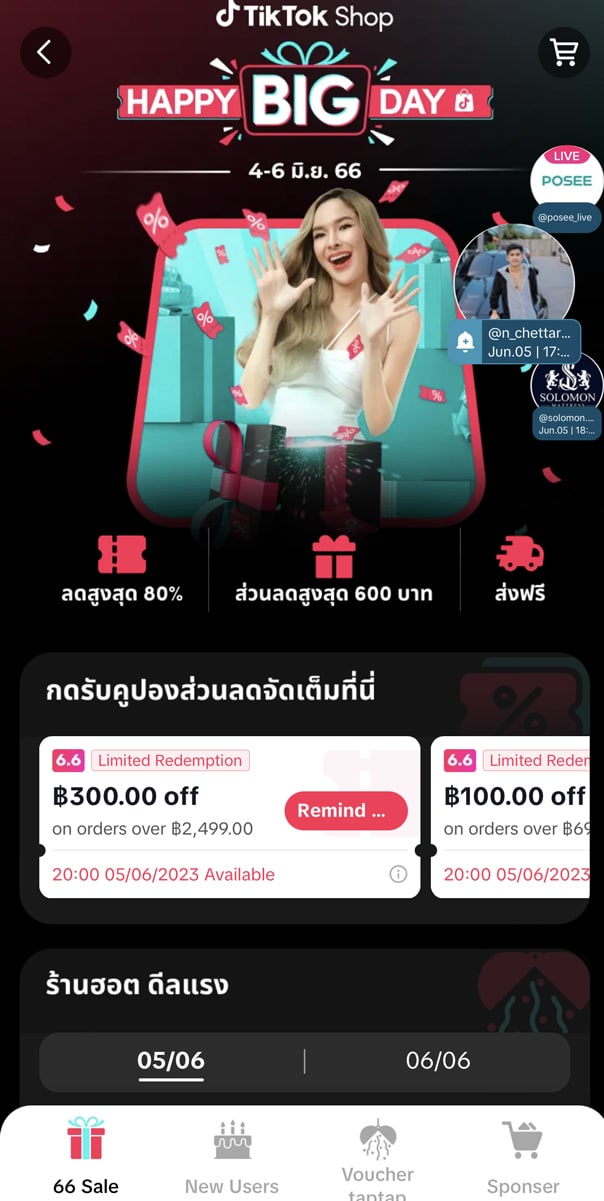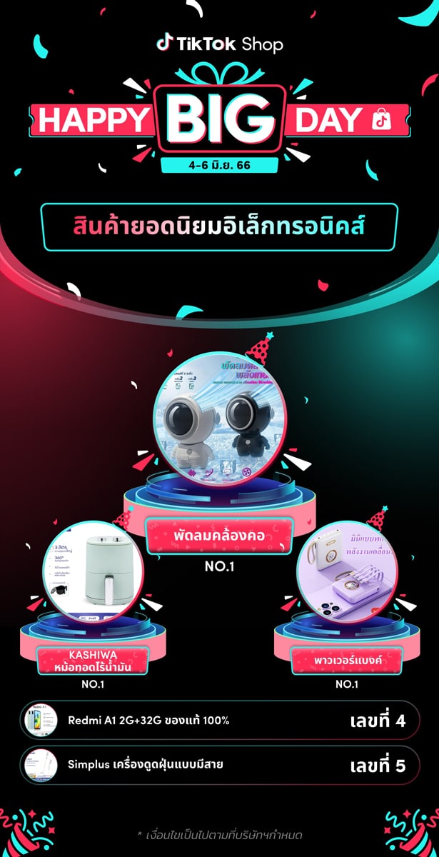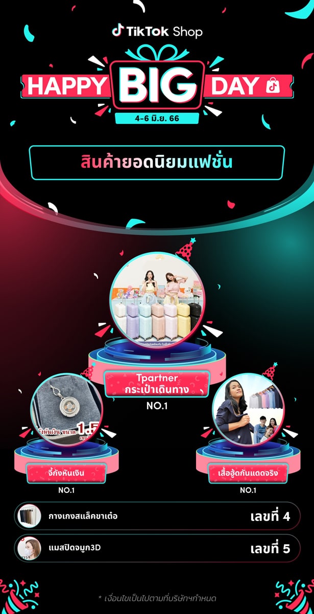 เพื่อฉลองครบรอบหนึ่งปีแรกกับความสำเร็จของ TikTok Shop ในประเทศไทย ได้จัดแคมเปญ “Happy Big Day” เพื่อมอบข้อเสนอสุดพิเศษสำหรับผู้ใช้ให้ได้รับประสบการณ์การช้อปปิ้งที่น่าตื่นตาตื่นใจบนแพลตฟอร์ม ในช่วงแคมเปญดังกล่าวมีสินค้าแฟชั่นที่ได้รับความนิยมสูงสุด 5 อันดับแรกได้แก่ กระเป๋าเดินทาง เสื้อฮู้ดกันแดด จี้กังหันเงิน กางเกง-สแล็ค และแมสปิดจมูกแบบ 3D และสินค้าอิเล็กทรอนิกส์ที่ได้รับความนิยมสูงสุด 5 อันดับแรกได้แก่ พัดลมคล้องคอ หม้อทอดไร้น้ำมัน พาวเวอร์แบงค์ สมาร์ทโฟน และ เครื่องดูดฝุ่นแบบมีสาย ในช่วงแคมเปญนี้ยังส่งผลให้ยอดขายสินค้าออนไลน์โดยรวมเพิ่มขึ้นถึง 34% โดยมีคำสั่งซื้อและมีการทำธุรกรรมเพิ่มขึ้นถึง 30% และแคมเปญนี้ยังได้รับการแสดงผลรวมกว่า 39 ล้านครั้ง โดยมียอดการรับชมวิดีโอทั้งหมดถึง 35 ล้านครั้ง จากผลลัพธ์ในการดำเนินงานช่วงปีแรก ได้แสดงให้เห็นว่า TikTok Shop ได้เป็นช่องทางที่ช่วยเชื่อมโยงผู้ค้าและธุรกิจทั้งรายใหญ่และรายเล็กในระดับชุมชนให้เข้าถึงผู้บริโภคมากขึ้น และส่งเสริมธุรกิจของพวกเขาเหล่านั้นได้มากขึ้นทั้งในระดับภูมิภาคและในประเทศไทย ด้วยเหตุนี้ TikTok Shop จึงได้เตรียมสิทธิพิเศษ และกิจกรรมส่งเสริมการขายอีกมากมายทั้งเพื่อผู้บริโภคและร้านค้าที่เข้าร่วม ในช่วง Double digit ที่จะเกิดขึ้นในช่วงครึ่งปีหลัง