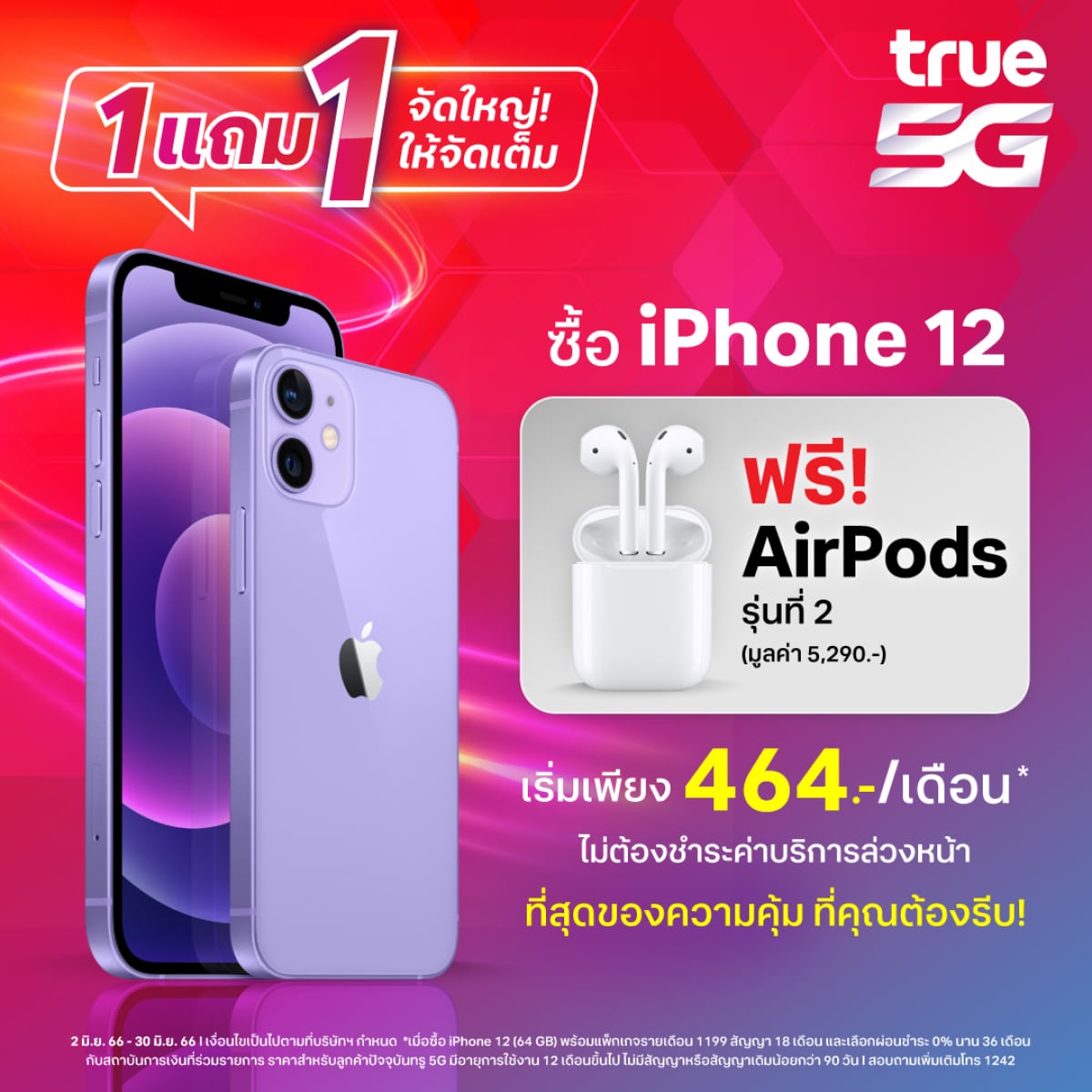 True 5G จัดเต็มซื้อ 1 แถม 1 ซื้อ iPhone 12 แถมฟรี AirPods 2 มูลค่า 5,290 บาท ตั้งแต่วันนี้ถึง 30 มิถุยน 2566
