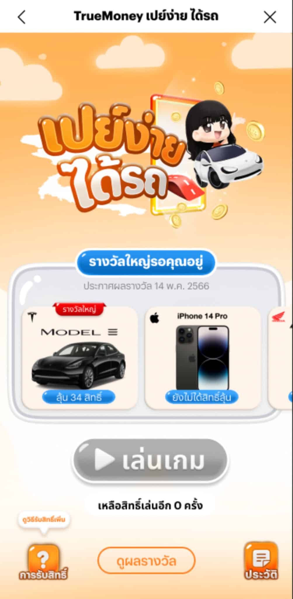 - เล่นเสร็จ แคปหน้าจอโชว์สิทธิ์ลุ้นรางวัลประจำเดือน เพื่อแชร์ใน Facebook หรือ Twitter เปิดแชร์ Public และใส่แฮชแท็ก #TrueMoneyเปย์ง่ายได้รถ เพื่อรอลุ้นรางวัลประจำสัปดาห์