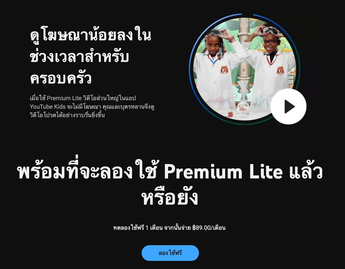 วันนี้สำหรับผู้ใช้งานในประเทศไทย สามารถ สมัคร แพ็กเกจใหม่ YouTube Premium Lite ได้แล้ว โดยมีราคาจ่ายรายเดือนเพียงแค่ 89 บาท ทดลองใช้งานฟรี 1 เดือน
