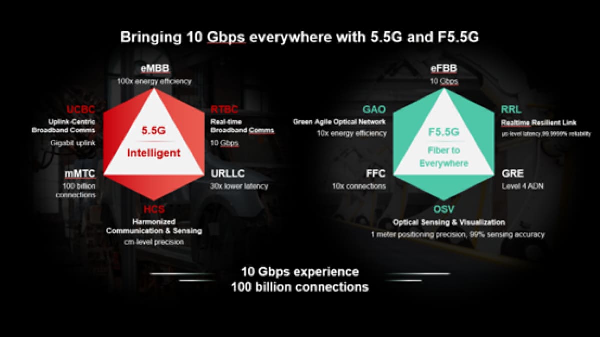 หัวเว่ย นำเสนอแนวคิด “5.5G Era” ซึ่งประกอบด้วยโซลูชันแบบครบชุด อันเกิดจากการบูรณาการเทคโนโลยีแบบครบสูตร ประกอบด้วยเทคโนโฃยี 5.5G, F5.5G, และ Net5.5G โดยเครือข่าย 5.5G จะรองรับความเร็วดาวน์ลิงก์ระดับสูงสุดที่ 10 กิกะบิต และอัพลิงค์ระดับสูงสุดที่ 1 กิกะบิต รองรับการเชื่อมต่อ 1 แสนล้านครั้ง ขณะเดียวกันเครือข่ายยังมีความอัจฉริยะที่จะช่วยยกระดับอุตสาหกรรม 5G และผู้ประกอบการเครือข่ายขึ้นสู่ระดับใหม่ ทั้งนี้ ด้วยอัตราความหน่วงในการรับส่งข้อมูลต่ำ (low latency) ประกอบกับความเร็วดาวน์ลิงก์ 10 กิกะบิต และอัปลิงก์ 1 กิกะบิต ช่วยให้ผู้บริโภคได้รับประสบการณ์ที่สมจริงมากยิ่งขึ้นจากบริการ เช่น XR Pro การแสดงผลแบบโฮโลแกรม และวีดีโอภาพ 3 มิติ เป็นต้น