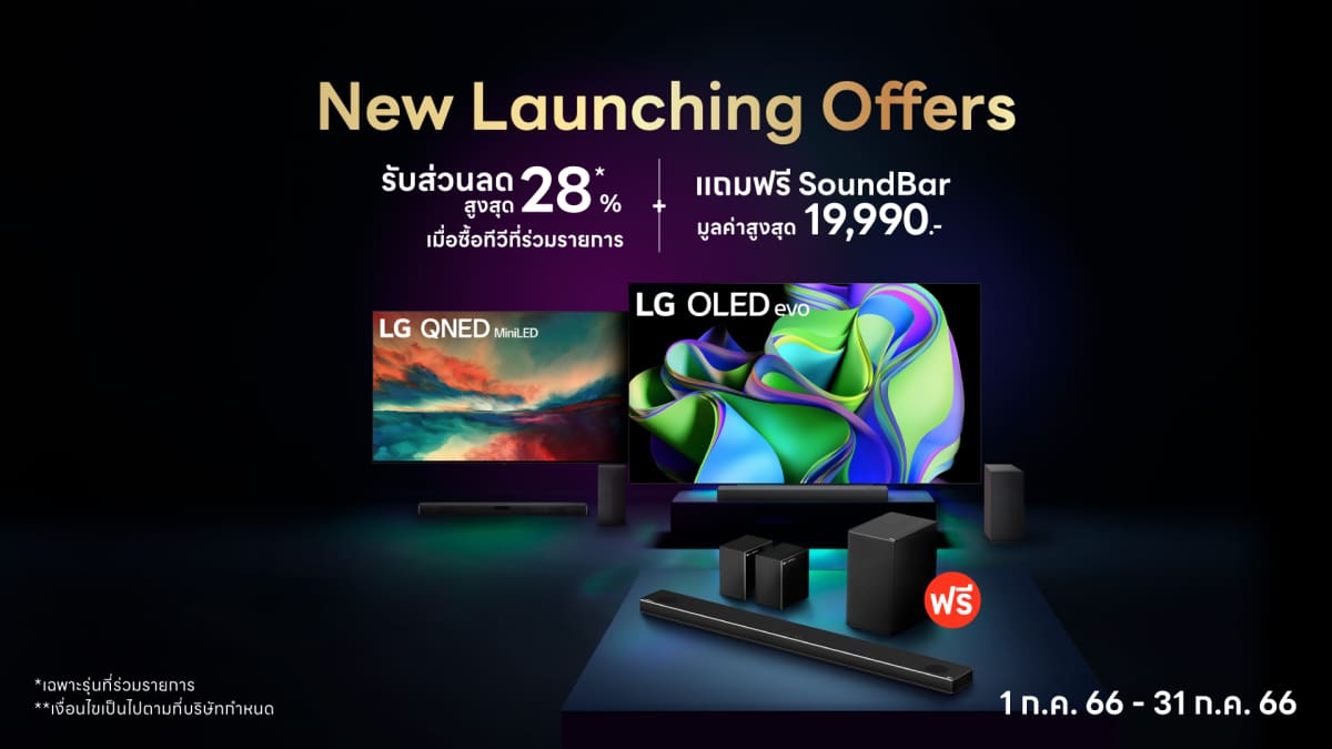 พร้อมกันนี้ยังส่งข้อเสนอสุดพิเศษ “ซื้อทีวีรับฟรีซาวด์บาร์” รับสิทธิพิเศษ 2 ต่อ ทั้งส่วนลด และของแถมซาวด์บาร์มูลค่าสูงสุด 19,990 บาท ข้อเสนอพิเศษนี้ สำหรับทีวีรุ่นใหม่ล่าสุดของแอลจีในปี 2023 ที่เข้าร่วมรายการ โดยมาพร้อมเทคโนโลยีระดับพรีเมียม อาทิ OLED TV ที่สุดของทีวีโอเลตเปล่งแสงเองซึ่งให้ความสว่างและคมชัดยิ่งกว่า และ QNED TV ที่มอบสีสันเจิดจรัสด้วยเทคโนโลยี Quantum Dot และ NanoCell โดยข้อเสนอสุดพิเศษสำหรับทีวีรุ่นที่ร่วมรายการ มีดังนี้