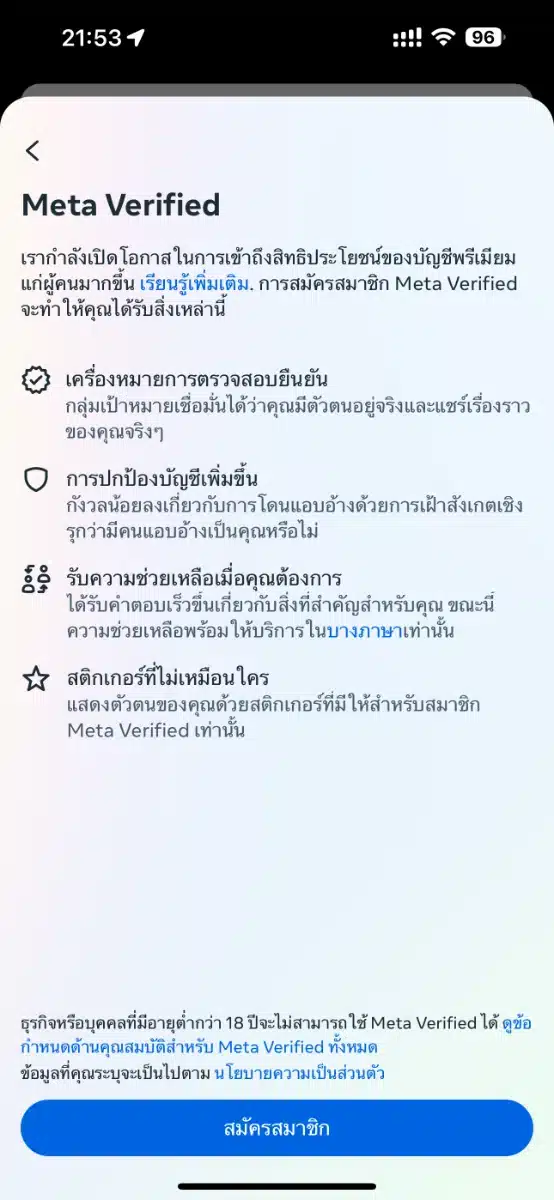 ในตอนแรกนี้ การสมัครจะรองรับเฉพาะบัญชีผู้ใช้เท่านั้น ยังไม่สามารถสมัครของบัญชีธุรกิจได้ ดังนั้นใครจะทำ Meta Verified ให้กับเพจของแบรนด์หรือร้านค้า ตอนนี้ยังทำไม่ได้นะ