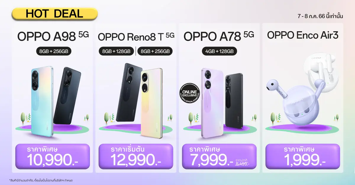 - OPPO A78 5G (8+128GB) สมาร์ตโฟน 5G พร้อมอัพสนุกให้สุดสปีด พิเศษเพียง 8,999 บาท ที่ Lazada และ OPPO A78 5G (4+128GB) พิเศษเพียง 7,999 จากราคาปกติ 8,499 บาท ที่ Shopee *จำหน่ายเฉพาะออนไลน์