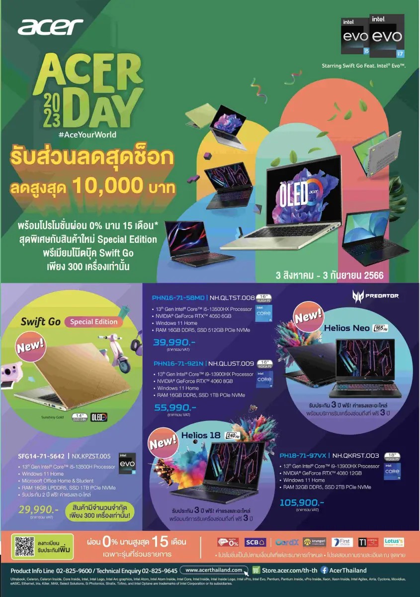PROMOTION! Acer Day 2023 #AceYourWorld พบนวัตกรรมเทคโนโลยีที่เอเซอร์คัดสรรมาเพื่อตอบโจทย์ดิจิทัลไลฟ์สไตล์นำเสนอในราคาสุดพิเศษ ลดสูงสุด 10,000 บาทที่ร้านค้าตัวแทนจำหน่ายเอเซอร์ และผ่อน 0% นานสูงสุด 15 เดือนสำหรับบัตรเครดิตที่ร่วมรายการ