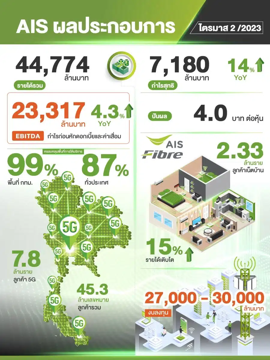สำหรับ ผลประกอบการ ไตรมาส 2 ของปี 2566 AIS มีรายได้รวมอยู่ที่ อยู่ที่ 44,774 ล้านบาท ลดลง 1.1% เมื่อเทียบกับไตรมาส 2 ปีก่อน และลดลง 4.1% จากไตรมาสก่อน ในขณะที่รายได้จากการให้บริการหลักเติบโตขึ้น 1.8% จากไตรมาส 2 ปีก่อนและ 1.1% จากไตรมาสก่อน และจากการบริหารจัดการต้นทุนค่าใช้จ่ายอย่างมีประสิทธิภาพ รวมทั้งการนำเทคโนโลยี AI เข้าปรับใช้ในกระบวนการดำเนินงาน โดยเฉพาะด้านโครงข่ายให้เหมาะสมกับการใช้งานของลูกค้า ทำให้ เอไอเอสมีกำไรสุทธิที่ 7,180 ล้านบาท เติบโตขึ้น 14% เมื่อเทียบกับไตรมาส 2 ปีก่อน และเติบโตขึ้น 6.3% จากไตรมาสก่อนหน้า โดยมีกำไรก่อนหักดอกเบี้ย ภาษีและค่าเสื่อมราคา (EBITDA) เท่ากับ 23,317 ล้านบาท เติบโต 4.3% จากช่วงเดียวกันของปีก่อน
