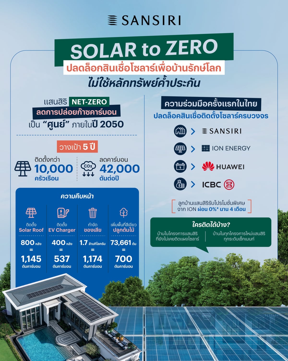 ความร่วมมือในแคมเปญ SOLAR to ZERO ครั้งนี้ สอดคล้องกับพันธกิจของแสนสิริ บริษัทอสังหาฯ รายแรกของไทยที่ตั้งเป้าหมายการปล่อยก๊าซเรือนกระจกสุทธิเป็นศูนย์ (Net-Zero) ภายในปี 2050 เพื่อมุ่งสร้างจุดเปลี่ยนด้านสิ่งแวดล้อมอย่างยั่งยืน ปัจจุบัน แสนสิริ ได้ติดตั้ง Solar Roof ไปแล้วกว่า 800 หลัง เทียบเท่าการลดคาร์บอนแล้วกว่า 1,145 ตันคาร์บอน ติดตั้ง EV Charger ไปแล้ว 400 หลัง เทียบเท่าการลดคาร์บอนแล้วกว่า 537 ตันคาร์บอน กำจัดของเสียในอยู่อาศัยแล้ว 1.7 ล้านกิโลกรัม เทียบเท่าการลดปริมาณคาร์บอนแล้วกว่า 1,174 ตันคาร์บอน เพิ่มพื้นที่สีเขียวด้วยการปลูกต้นไม้แล้ว 73,661 ต้น เทียบเท่าการลดคาร์บอนกว่าแล้ว 700 ตันคาร์บอน