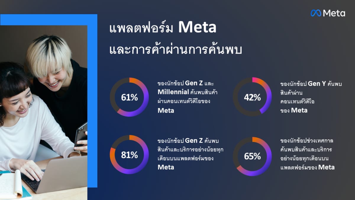 การซื้อขายภายในร้านค้าและช่องทางออนไลน์ยังคงเป็นช่องทางสำคัญสำหรับการช้อปช่วงวันหยุดเทศกาล โดยนัก ช้อป ในภูมิภาคเอเชียแปซิก 66% และนักช้อปชาว ไทย กว่า 76% ระบุว่าพวกเขาค้นพบสินค้าผ่านแพลตฟอร์มของ Meta ก่อนที่จะพบสินค้าบนเว็บไซต์อีคอมเมิร์ซ หรือจากการค้นหาออนไลน์ หรือสื่อออฟไลน์ นอกจากนี้ 45% ของนักช้อปในภูมิภาคเอเชียแปซิก ยังเห็นด้วยว่า สินค้าที่พวกเขาค้นพบบนแพลตฟอร์มของ Meta มีความเกี่ยวข้องและเป็นสิ่งที่พวกเขามองหามากกว่าสินค้าที่พบบนแพลตฟอร์มอื่น