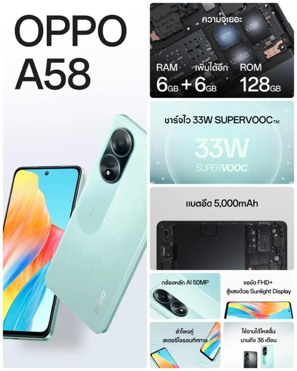 เปิดตัว OPPO A58 พร้อมวางจำหน่ายในไทยอย่างเป็นทางการ RAM 6GB+6GB ชาร์จไว 33W SUPERVOOC ลำโพงสเตอริโอคู่ ราคา 6,299 บาท