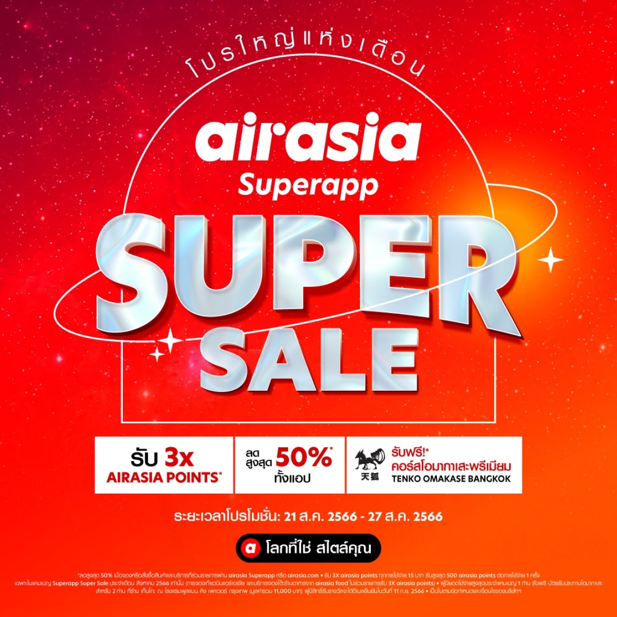 airasia Superapp Super Sale จัดเต็มเดือนสิงหา 21 – 27 สิงหาคม 2566 มอบ ส่วนลด สูงสุด 50%* เที่ยวบิน โรงแรม รถรับ-ส่ง จองร้านอาหาร และอีกมากมาย!