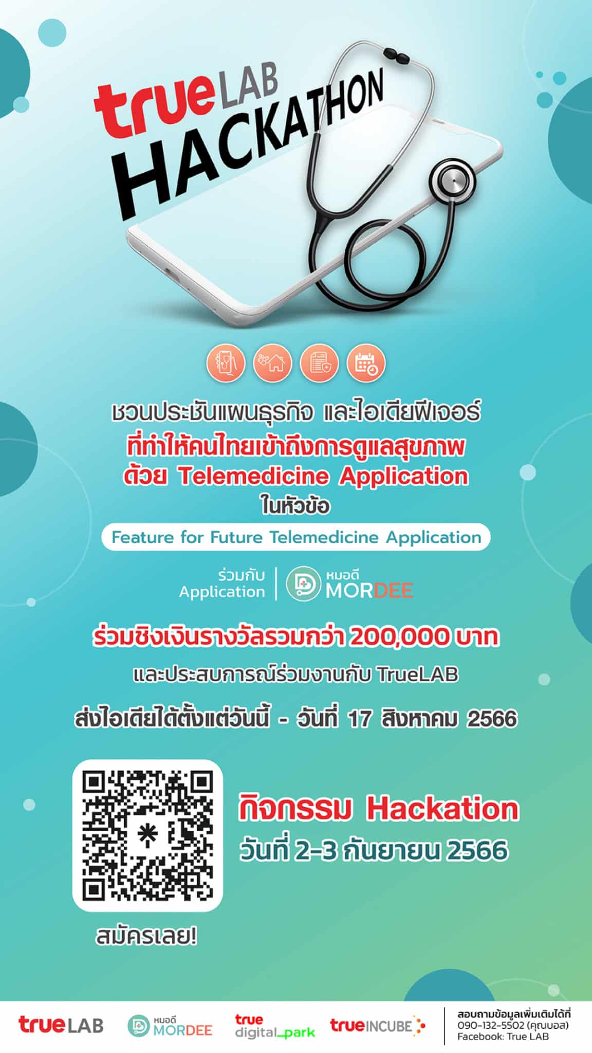 พร้อมจัดงานเปิดบ้านแบ่งปันองค์ความรู้และประเดิมเปิดรับสมัครในงาน หมอดี Hackathon Open House เมื่อ 5 ส.ค. ที่ผ่านมา สำหรับทีมที่ผ่านเข้ารอบจะได้รับเงินรางวัล และสิทธิประโยชน์มากมาย พร้อมโอกาสต่อยอดธุรกิจกับกลุ่มทรูดิจิทัลเฮลท์ ก้าวสู่เส้นทางผู้ประกอบการรุ่นใหม่ สนใจสมัครได้แล้ววันนี้ ถึง 17 ส.ค. 2566 ประกาศผลคัดเลือกแผนงานธุรกิจที่เข้ารอบ 20 ทีม วันที่ 20 ส.ค. 2566 และปฐมนิเทศทีมที่เข้ารอบ ในวันที่ 26 ส.ค. 2566 งาน Hackathon ในวันที่ 2-3 ก.ย. 2566 ดูรายละเอียดเพิ่มเติมได้ที่ Facebook True Lab