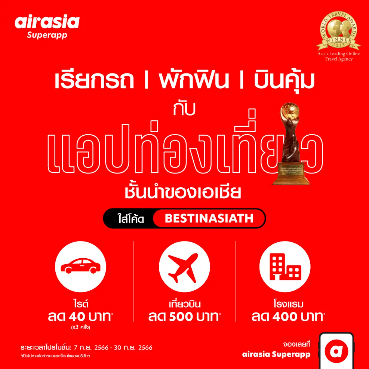 ตั้งแต่วันที่ 7 – 30 กันยายน 2566 ผู้ใช้ airasia Superapp จะได้รับส่วนลด 500 บาท* ด้วยโค้ดส่วนลด [BESTINASIATH] เมื่อจองสายการบิน (ไม่รวมเที่ยวบินของแอร์เอเชีย) โดยมียอดจองขั้นต่ำ 2,700 บาท และ ส่วนลด 400 บาท [BESTINASIATH] เมื่อจองโรงแรมใด ๆ ก็ตามไปยังจุดหมายปลายทางที่ต้องการ โดยมียอดใช้จ่ายขั้นต่ำ 3,000 บาท นอกจากนี้ผู้ใช้ยังสามารถเรียกรถ ariasia ride ไปได้ทั่วเมือง กับแอปที่ดีที่สุดในเอเชีย! พร้อมเพลิดเพลินกับส่วนลดอีก 40 บาท ถึง 3 เที่ยว เพียงใส่โค้ด [BESTINASIATH] เมื่อมีค่าโดยสารขั้นต่ำ 150 บาท* เพื่อให้การเดินทางทุกวันของคุณพบกับความสะดวกสบาย และคุ้มค่าที่สุด ให้คุณหมดห่วงทุกเรื่องการเดินทาง ได้รถชัวร์ ได้รถไว ไม่มีผิดแผน สามารถจองรถล่วงหน้าได้ที่ ไอคอน ‘ride’ ในairasia Superapp