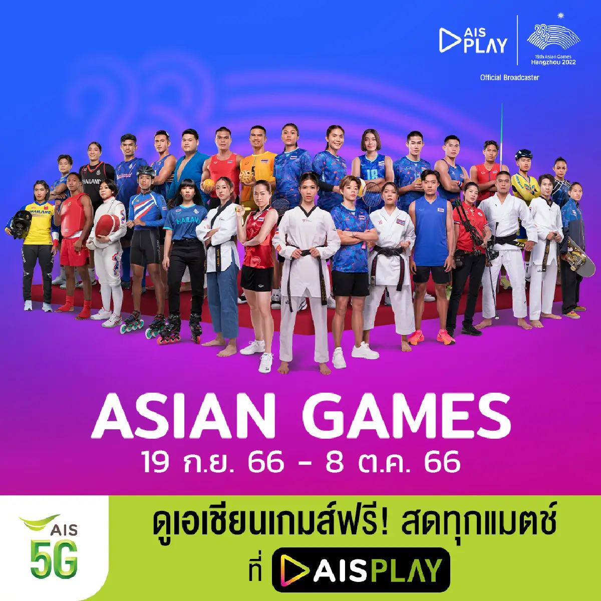 ในปีนี้ประเทศไทยได้ส่งนักกีฬาเข้าร่วมชิงชัยกว่า 941 คน จาก 40 ชนิดกีฬา จาก 49 สมาคมกีฬา ซึ่งมีการบรรจุกีฬาใหม่เพิ่มอีก 2 ชนิดกีฬา คือ อีสปอร์ต และเบรกแดนซ์ กีฬายอดนิยมของ Gen Z ทำให้เอเชียนเกมส์ครั้งนี้มีความแปลกใหม่ และน่าติดตามมากกว่าทุกครั้งที่ผ่านมา ชวนคนไทยร่วมส่งแรงใจเชียร์นักกีฬาไทยคว้าเหรียญกลับบ้านผ่าน AIS PLAY ประเดิมการถ่ายทอดสดการแข่งขันนัดแรกในวันที่ 19 กันยายน 2566 เวลา 15.00 น. การแข่งขันฟุตบอลทีมชายไทย นัดแรก เจอ ทีมชาติบาห์เรน เวลา 18.00 น. วอลเลย์บอล ประเภทชาย ระหว่างทีมชาติไทย พบฮ่องกง และไฮไลท์สำคัญ วันที่ 23 กันยายน 2566 เวลา 19.00 น. พิธีเปิดการแข่งขัน และต้อนรับนักกีฬาไทยในสนามหางโจว โอลิมปิก สปอร์ต เซ็นเตอร์ หรือสนามดอกบัวยักษ์ ไปพร้อมกัน