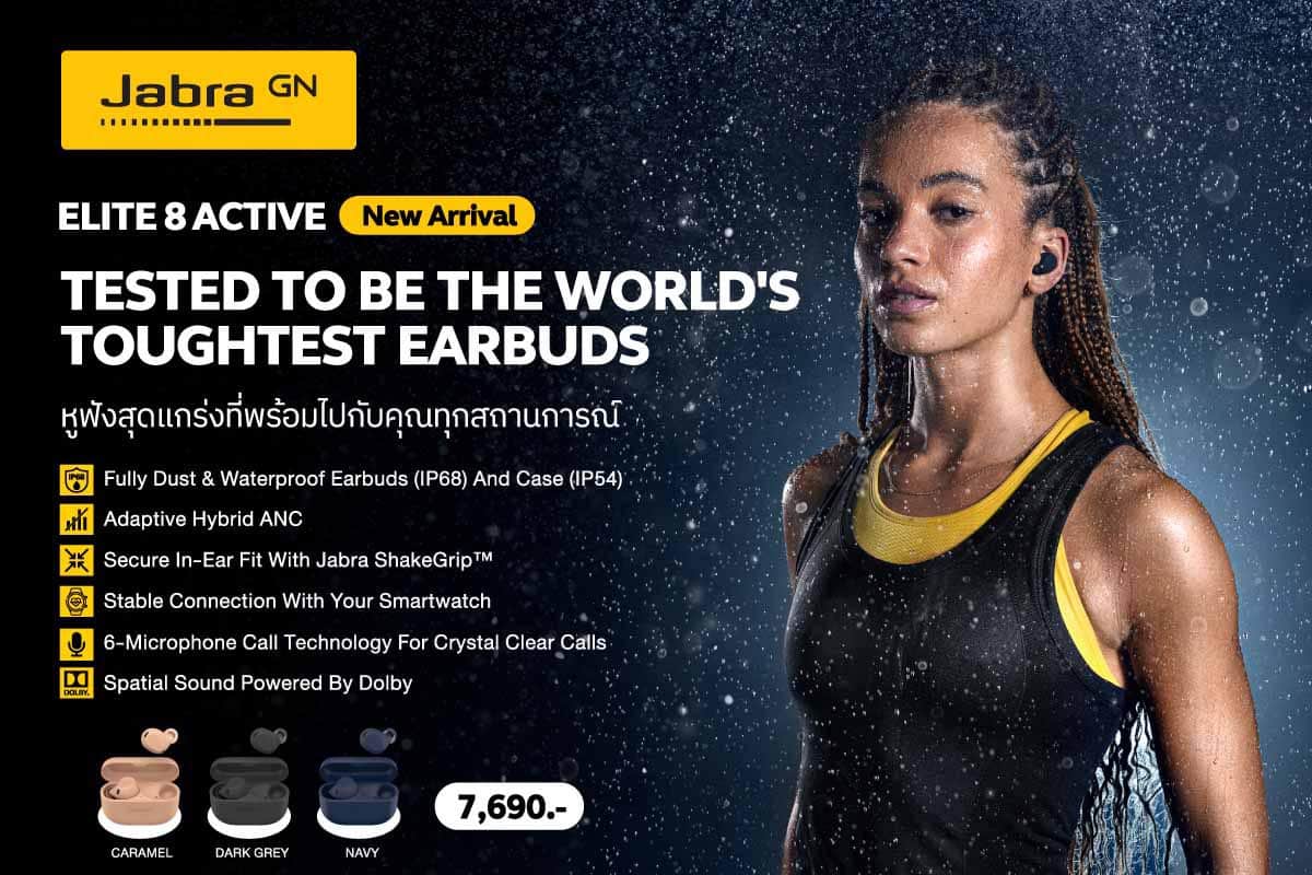 Jabra Elite 8 Active หูฟัง ที่ชูจุดเด่นเรื่องความแข็งแกร่ง ทนทาน พร้อมการตัดเสียงรบกวนภายนอกที่ดีขึ้นกว่าเดิมถึง 1.6 เท่า ระบบเสียง Spatial Sound จาก Dolby และการเชื่อมต่อกับสมาร์ทวอช ราคา 7,690 บาท พร้อมรับสิทธิพิเศษจาก PUMA เมื่อซื้อหูฟังในช่วงเปิดตัว