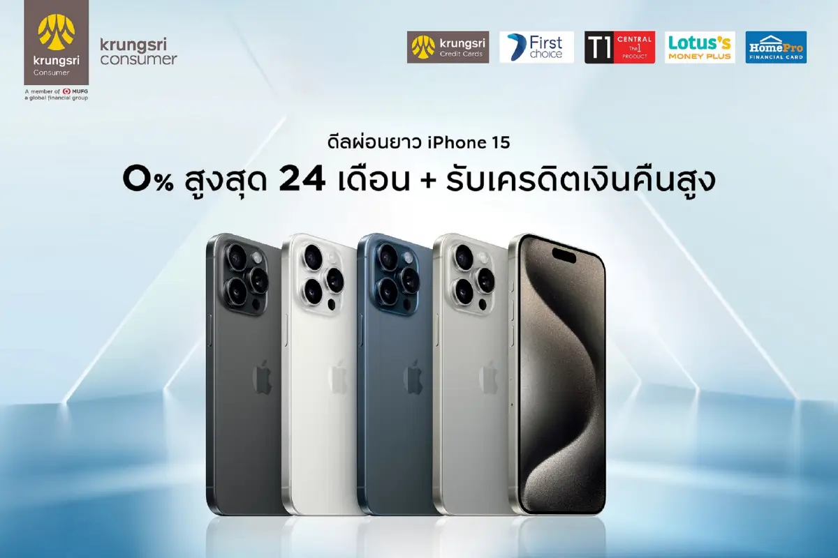 กรุงศรี คอนซูมเมอร์ ฉลองเปิดตัว iPhone 15 ทุกรุ่น เอาใจสมาชิกบัตรเครดิต กรุงศรี, บัตรกรุงศรีเฟิร์สช้อยส์, บัตรเครดิต เซ็นทรัล เดอะวัน, บัตรเครดิต โลตัส วีซ่า และบัตรเครดิต โฮมโปร วีซ่า ตั้งแต่ 15 กันยายน 2566 – 29 กุมภาพันธ์ 2567 กับดีลฮอต ‘ผ่อนยาวสะใจ 0% นานสูงสุด 24 เดือน’ ให้สมาชิกบัตรเป็นเจ้าของ iPhone 15 ได้ง่าย ๆ พร้อมรับเครดิตเงินคืนสูงสุด 18,000 บาท และยังใช้คะแนนแลกเครดิตเงินคืนเพิ่ม 12% เมื่อใช้จ่ายที่ AIS, True และ Advice