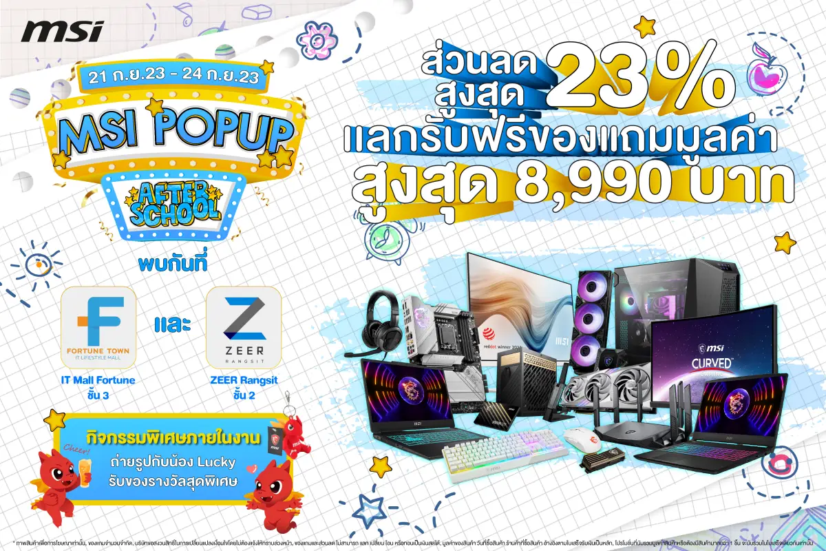 สำหรับงาน MSI POPUP AFTER SCHOOL ในครั้งนี้ จะมีขึ้นในวันที่ 21 กันยายน 2566 – 24 กันยายน 2566 ที่ IT Mall Fortune ชั้น 3 และ ZEER Rangsit ลานโปรโมชัน ชั้น 2
