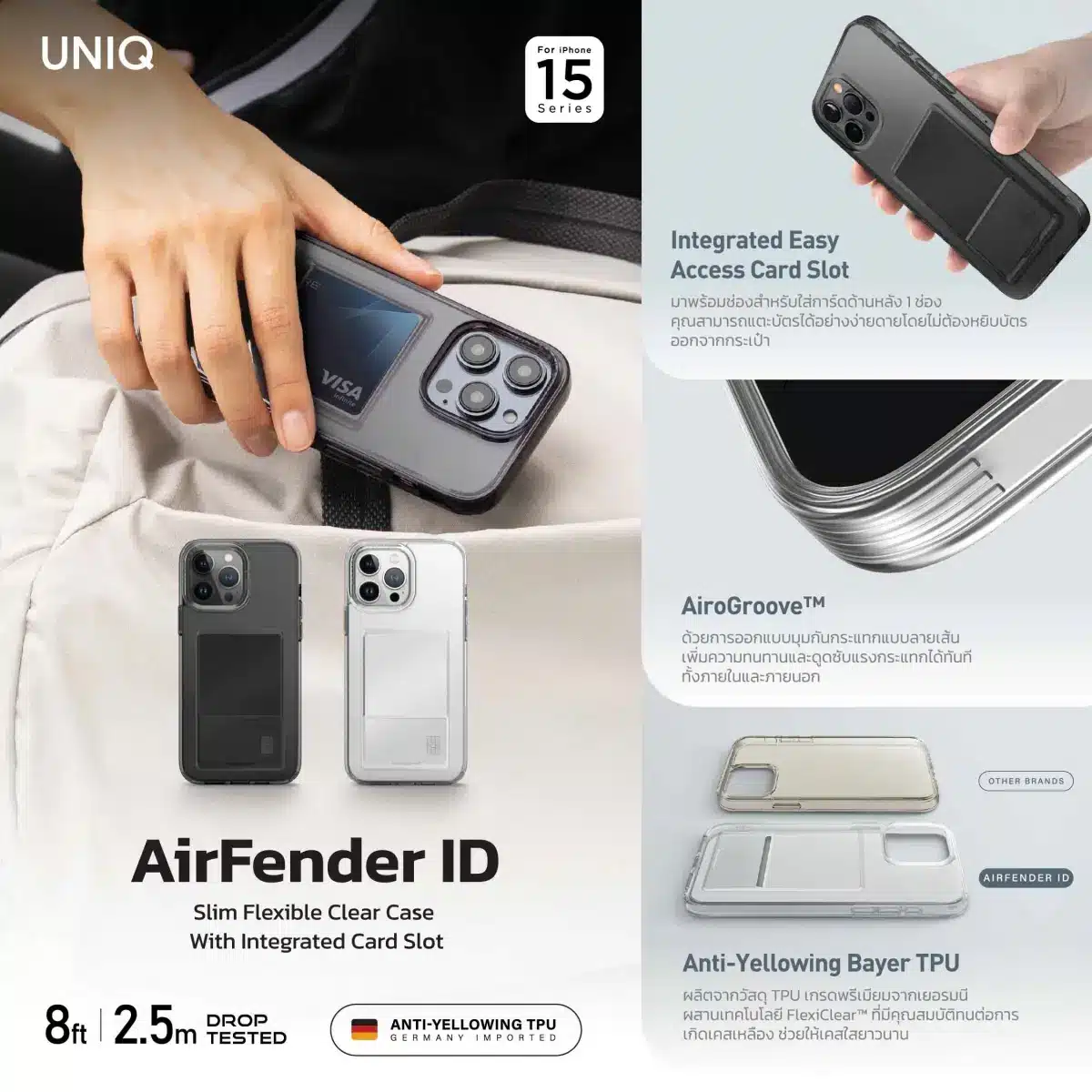 - UNIQ รุ่น Air Fender ID เคสยอดนิยม แบบใสสำหรับสายมินิมอลตัวจริงที่ได้รับการออกแบบมาให้มีความเบา บาง และยืดหยุ่นสูงเป็นพิเศษ สามารถบิดงอได้โดยไม่เสียรูปทรง มาพร้อมช่องสำหรับเสียบการ์ดด้านหลัง 1 ใบ ช่วยให้คุณแตะเข้า-ออกรถไฟฟ้าหรือสถานที่ต่าง ๆ ได้อย่างง่ายดาย ผลิตจากวัสดุ TPU เกรดพรีเมียมจากเยอรมนี ผสานเทคโนโลยี FlexiClear™ ที่ช่วยให้เคสของคุณคงความใสได้ยาวนาน
