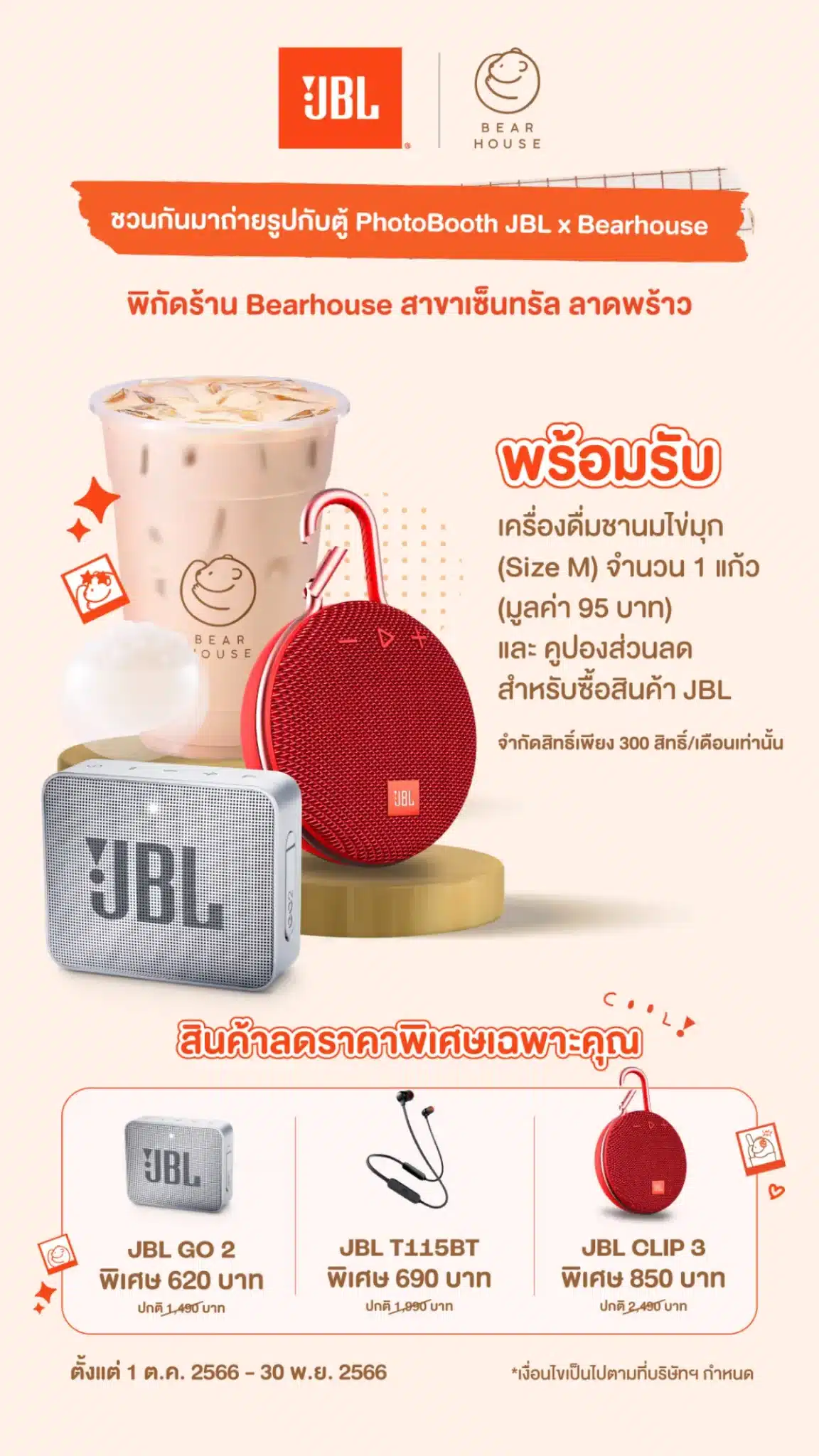 กิจกรรม ถ่ายรูปกับตู้ PhotoBooth ที่ร้าน Bearhouse สาขาเซ็นทรัลลาดพร้าว สแกน QR Code ลงทะเบียนเพื่อรับ E-Voucher ส่วนลด 40% สำหรับสินค้า JBL ที่ร่วมรายการ และลงทะเบียนเพื่อรับ E-Voucher รับชานมไข่มุก (Size M) จำนวน 1 แก้วฟรี!!