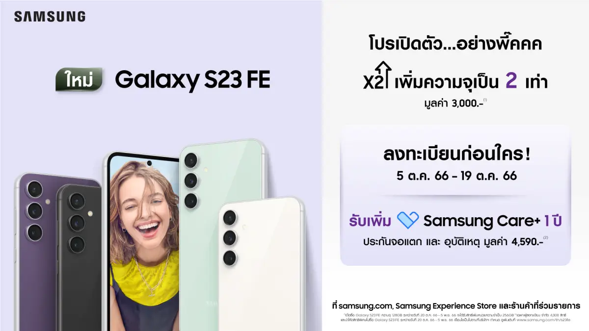 Galaxy S23 FE สมาร์ทโฟนแฟลกชิปน้องใหม่จาก Samsung พร้อมวางจำหน่าย 20 ต.ค. นี้ เปิดให้ลงทะเบียนก่อนใคร พร้อมรับ Samsung Care+ 1 ปี มูลค่า 4,590.- จากโปรเปิดตัว