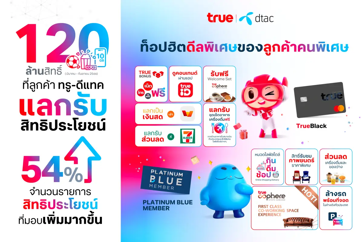 ตอกย้ำคุณค่า ที่เหนือกว่าด้วยความใส่ใจ…ทรู คอร์ปอเรชั่น ยกระดับการดูแลลูกค้ากว่า 51.1 ล้านรายทั่วไทยให้สุขยิ่งกว่าเมื่อมีกันและกัน ครอบคลุมครบทุกไลฟ์สไตล์มีความหมายกว่าที่เคย ไม่ว่าจะเป็น บริการจากทรู-ดีแทค ร้านอร่อย สุขภาพ-ความงาม ช้อปปิ้ง บันเทิง คอร์สเรียน เกม ท่องเที่ยว บริการช่วยเหลือด้านต่าง ๆ รวมถึงมอบประสบการณ์สุดเอ็กซ์คลูซีฟสำหรับลูกค้าทรูแบล็ค และ ดีแทค PLATINUM BLUE MEMBER อาทิ Exclusive Lounge @TrueSphere, Exclusive Personal Assistance, Exclusive Deals, Exclusive Activities และ Exclusive Package ที่จะมาร่วมสร้างสรรค์วันธรรมดา ๆ ให้เป็นวันที่พิเศษยิ่งขึ้น ด้วยความหลากหลาย และจำนวนรายการสิทธิประโยชน์ที่เพิ่มขึ้น 54% ทำให้ล่าสุดมีลูกค้าแลกรับสิทธิประโยชน์มากกว่า 120 ล้านสิทธิ์ พร้อมยังคงเดินหน้าคัดสรรสิทธิประโยชน์ ตลอดจนพันธมิตรใหม่ ๆ เพื่อเติมเต็มทุกความสุข ส่งมอบประสบการณ์ที่เหนือระดับ ตอบโจทย์ทุกความต้องการของลูกค้าในทุก ๆ วัน