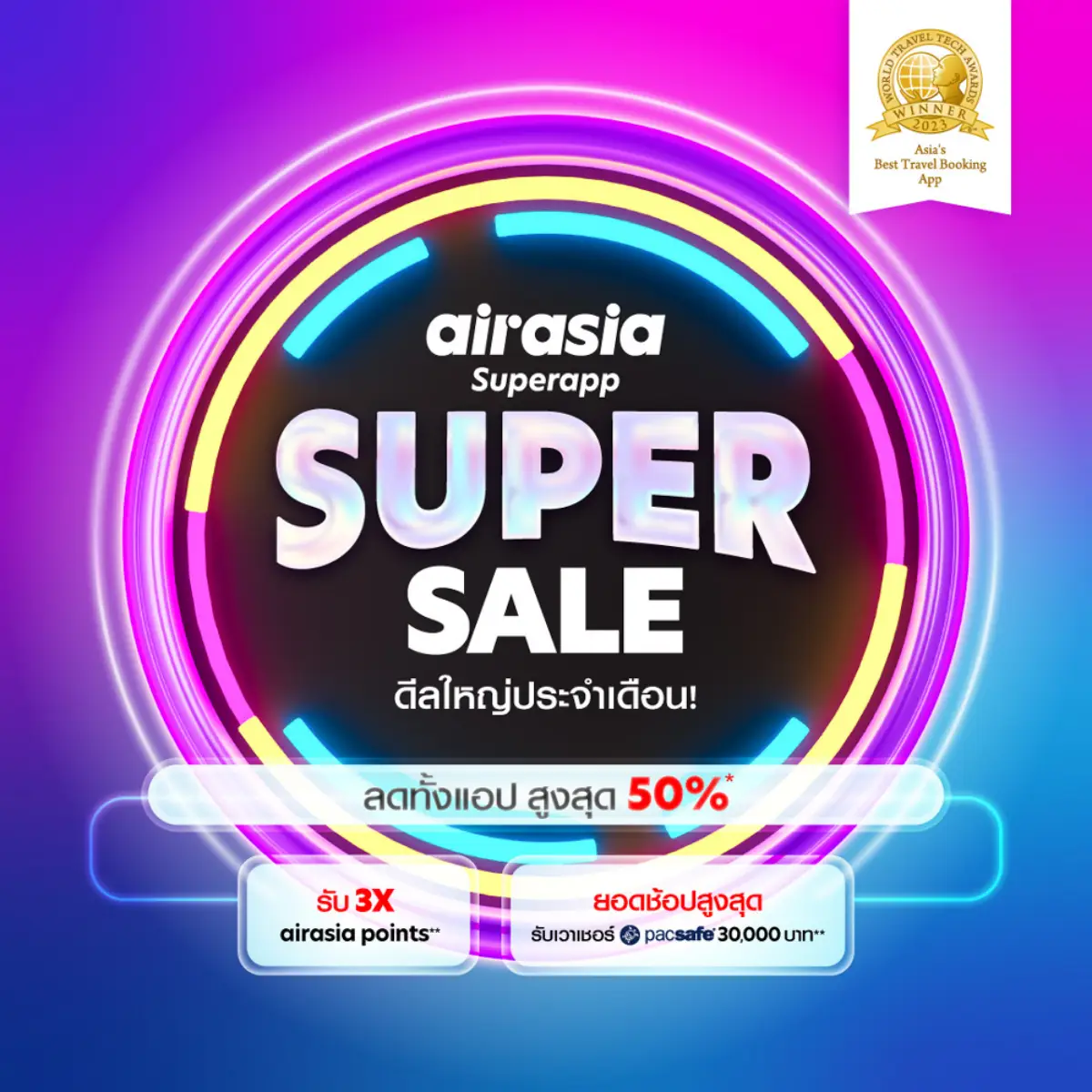 airasia Move (เดิมชื่อ airasia Superapp) ซูเปอร์แอปด้านการเดินทางและการท่องเที่ยวครบวงจรชั้นนำในภูมิภาคอาเซียนตั้งแต่การเดินทางทางอากาศจนถึงภาคพื้นดิน ลดสนั่นส่งท้ายปลายปีในแคมเปญ “Superapp Super Sale” ด้วย โปรโมชัน ลดสูงสุด 50%* พิเศษ! ผู้ที่มียอดช้อปสูงสุด รับเวาเชอร์กระเป๋า Pacsafe Voucher มูลค่า 30,000 บาท ฟรี*