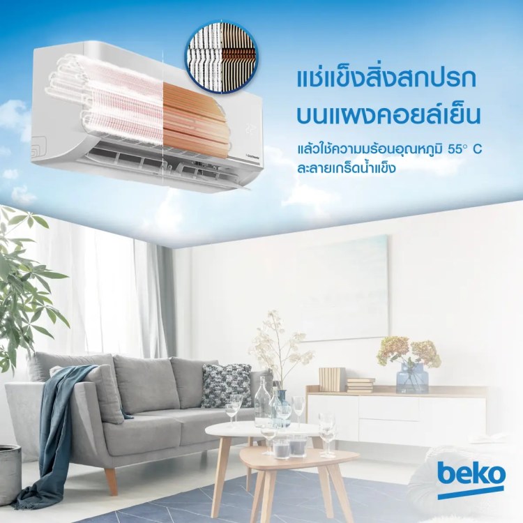แม้จะเป็นสิ่งที่มองไม่เห็นด้วยตาเปล่า แต่อากาศภายในบ้านที่สะอาดเป็นจุดเริ่มต้นสำคัญของการมีสุขภาพที่ดี จึงเป็นที่มาของเทคโนโลยี GoClean หรือระบบล้างแผงคอยล์อัตโนมัติในเครื่องปรับอากาศจาก Beko ซึ่งทำหน้าที่ขจัดแบคทีเรีย เชื้อรา และฝุ่น PM2.5 ที่บริเวณแผงคอยล์ด้วยการแช่เยือกแข็งสิ่งสกปรก แล้วใช้ระบบทำความร้อนที่อุณหภูมิ 55 องศาเซลเซียส เพื่อละลายเกล็ดน้ำแข็งให้เป็นน้ำ ชะล้างสิ่งสกปรกออกจากแผงคอยล์ได้อย่างหมดจดให้อากาศเย็นสะอาดในทุกฤดูกาล สร้างสุขภาพดีได้ทุกวันง่าย ๆ เพียงกดปุ่มบนรีโมท อีกทั้งยังช่วยลดความถี่ในการใช้บริการล้างแอร์ ตอบโจทย์ไลฟ์สไตล์ผู้บริโภคยุคใหม่ที่คำนึงถึงเรื่องสุขอนามัยและความสะดวกสบาย
