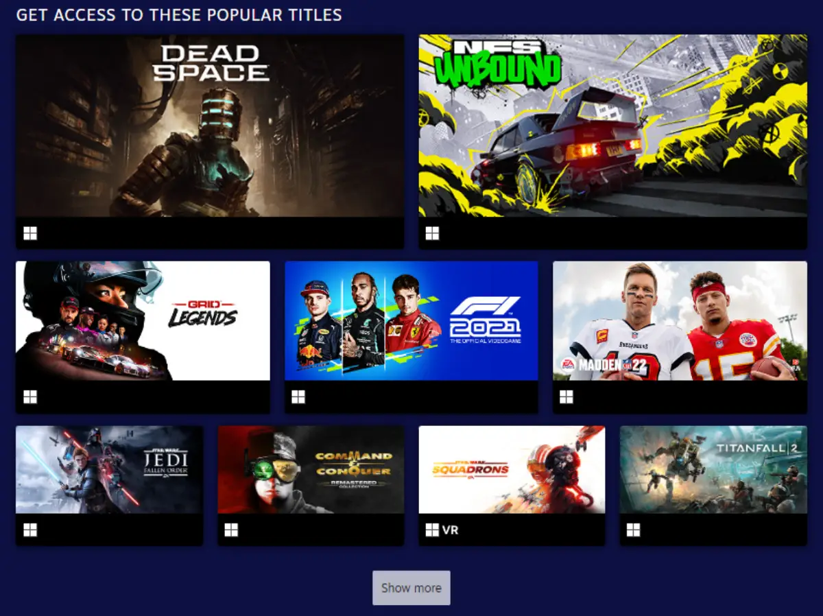 EA Play เป็นการสมัครบริการเหมาจ่ายเพื่อให้ได้เล่นเกมของ Electronic Arts จำนวนมหาศาลแบบจุใจเลยทีเดียว โดยแบ่งเป็น 2 แพ็กเกจ คือ ชนิดรายปี ตกอยู่ที่ ฿900.00 และชนิดรายเดือน ตกอยู่ที่ ฿150